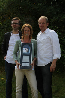 Foto links: Thea Eichholz bekommt von Verlagsleiter Ralf Markmeier und Musik-Chef Markus Bonnert im Juli 2012 den IMPALA-Musikpreis verliehen.