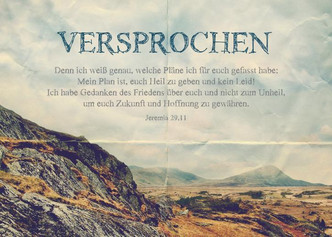 „Denn ich weiß genau, welche Pläne ich für euch gefasst habe: Mein Plan ist, euch Heil zu geben und kein Leid! Ich habe Gedanken des Friedens über euch und nicht zum Unheil, um euch Zukunft und Hoffnung zu gewähren!“ Jeremia 29,11