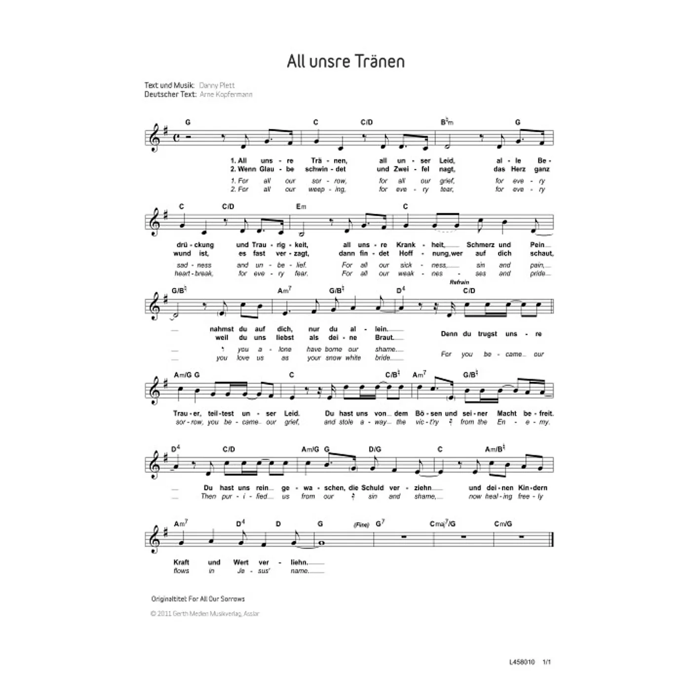 All unsre Tränen (diese Variante haben Sie gerade ausgewählt) (einstimmig, mit Akkorden, G-Dur) Danny Plett (Komposition, Text), Arne Kopfermann (Dt. Text, Übersetzung) |