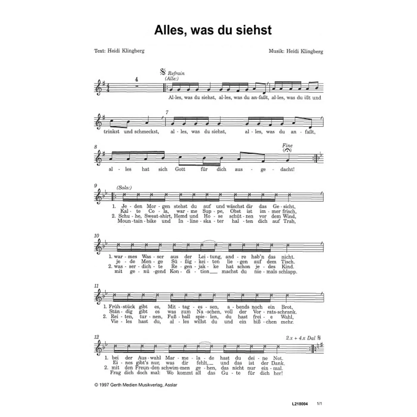 Alles, was du siehst (Klavier, einstimmig, G-Dur, gleiche Reihe) Heidi Klingberg (Komposition, Text), Andreas Mittelstädt (Bearbeiter) | Klavier, einstimmig, G-Dur, gleiche Reihe | 2,80 € |