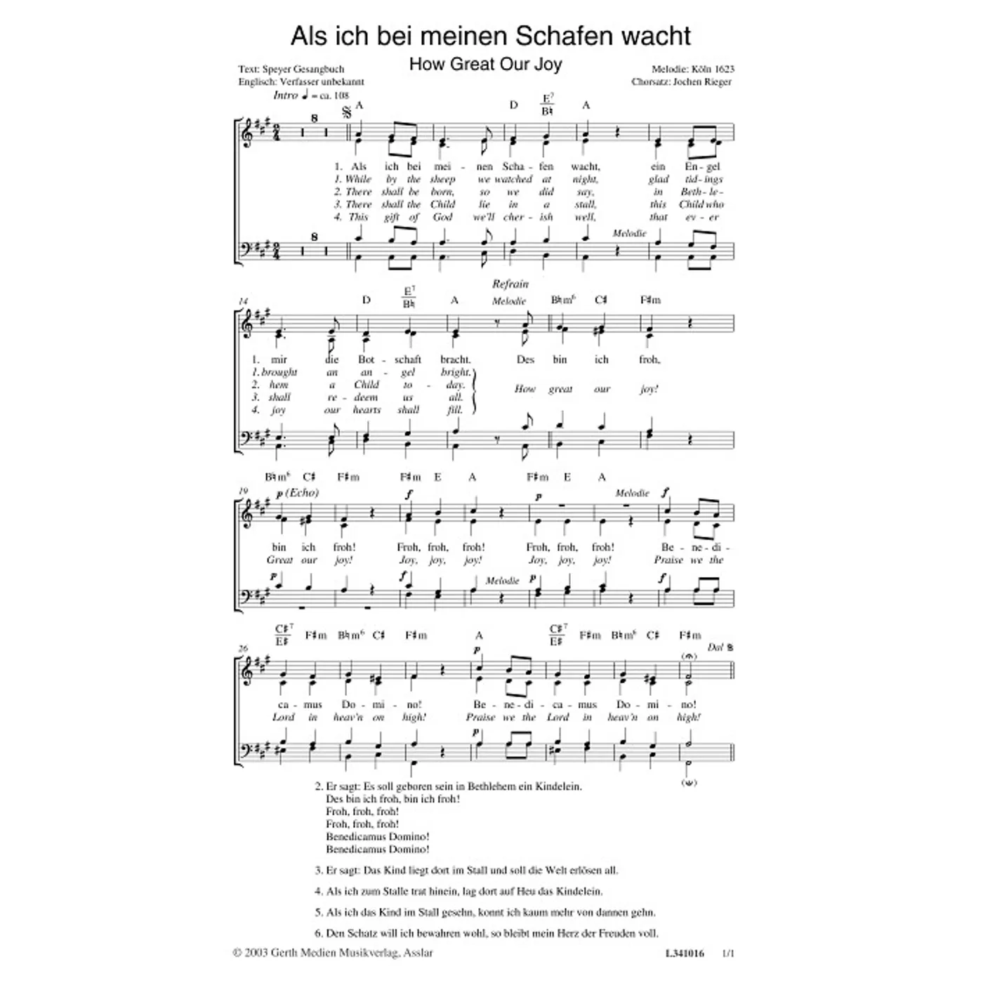 Als ich bei meinen Schafen wacht (traditionell, Klavier, gemischter Chor, mit Akkorden, vierstimmig, A-Dur) Markus Martitz (Bearbeiter), Jochen Rieger (Bearbeiter) | traditionell, Klavier, gemischter Chor, mit Akkorden, vierstimmig, A-Dur | 2,80 € |