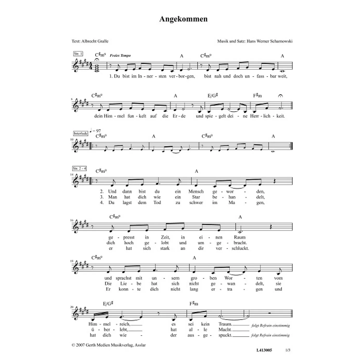 Angekommen (Klavier, gemischter Chor, mit Akkorden, vierstimmig, Cis-Moll) Albrecht Gralle (Text), Hans Werner Scharnowski (Chorsatz, Komposition), Michael Schlierf (Klaviersatz) | Klavier, gemischter Chor, mit Akkorden, vierstimmig, Cis-Moll | 3,80 € |