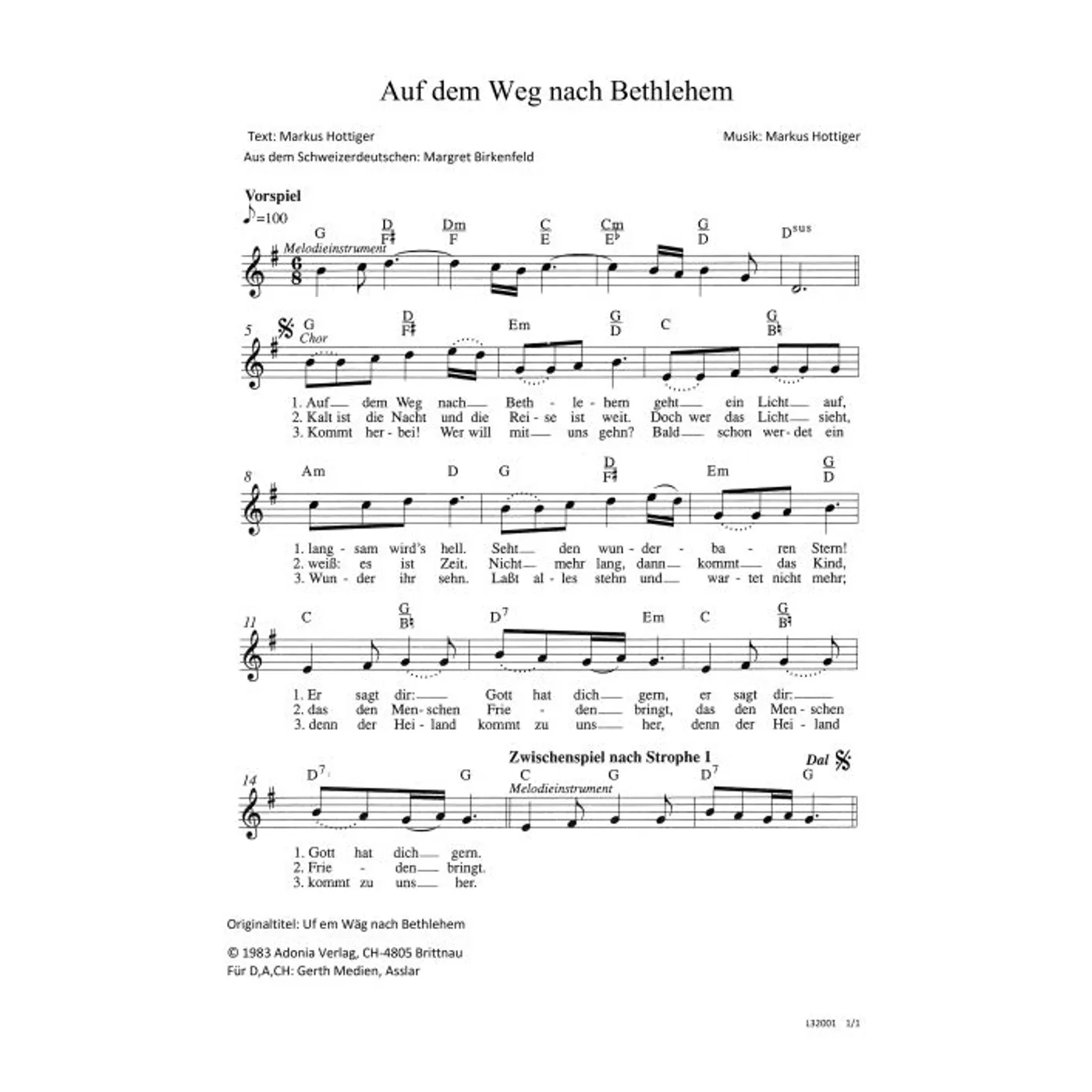 Auf dem Weg nach Bethlehem (diese Variante haben Sie gerade ausgewählt) (einstimmig, mit Akkorden, G-Dur) Markus Hottiger (Komposition, Text), Margret Birkenfeld (Übersetzung) |