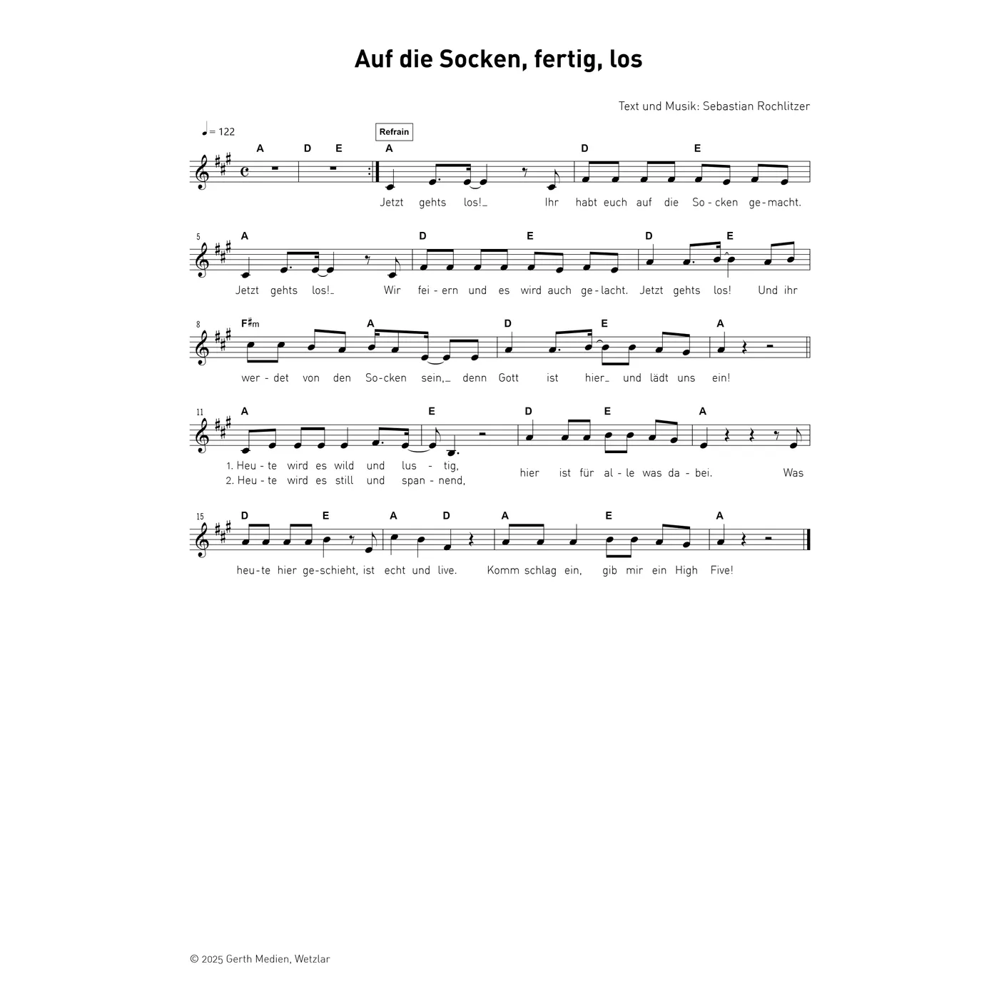 Auf die Socken fertig los (diese Variante haben Sie gerade ausgewählt) (Kinderlieder, einstimmig, A-Dur) Sebastian Rochlitzer (Text, Melodie) |