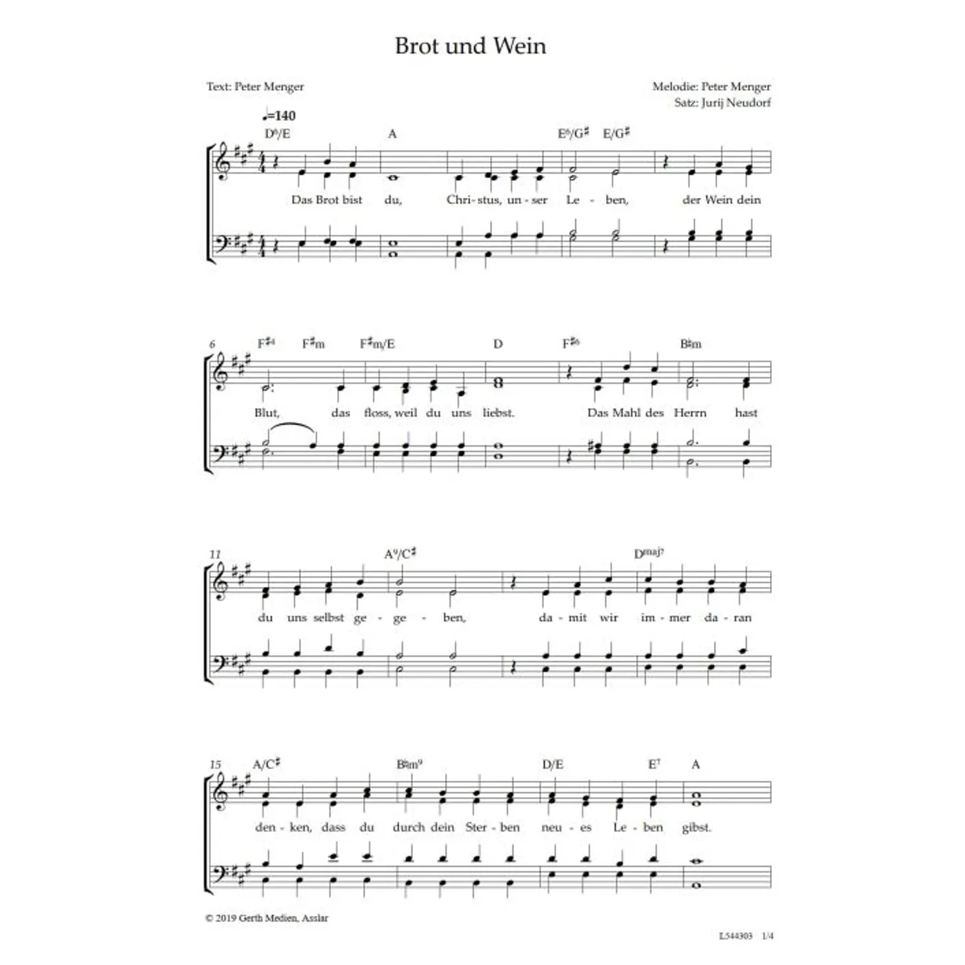 Brot und Wein (diese Variante haben Sie gerade ausgewählt) (Gemeindelied, modern, gemischter Chor, mit Akkorden, vierstimmig, A-Dur) Peter Menger (Komposition, Text), Jurij Neudorf (Chorsatz) |