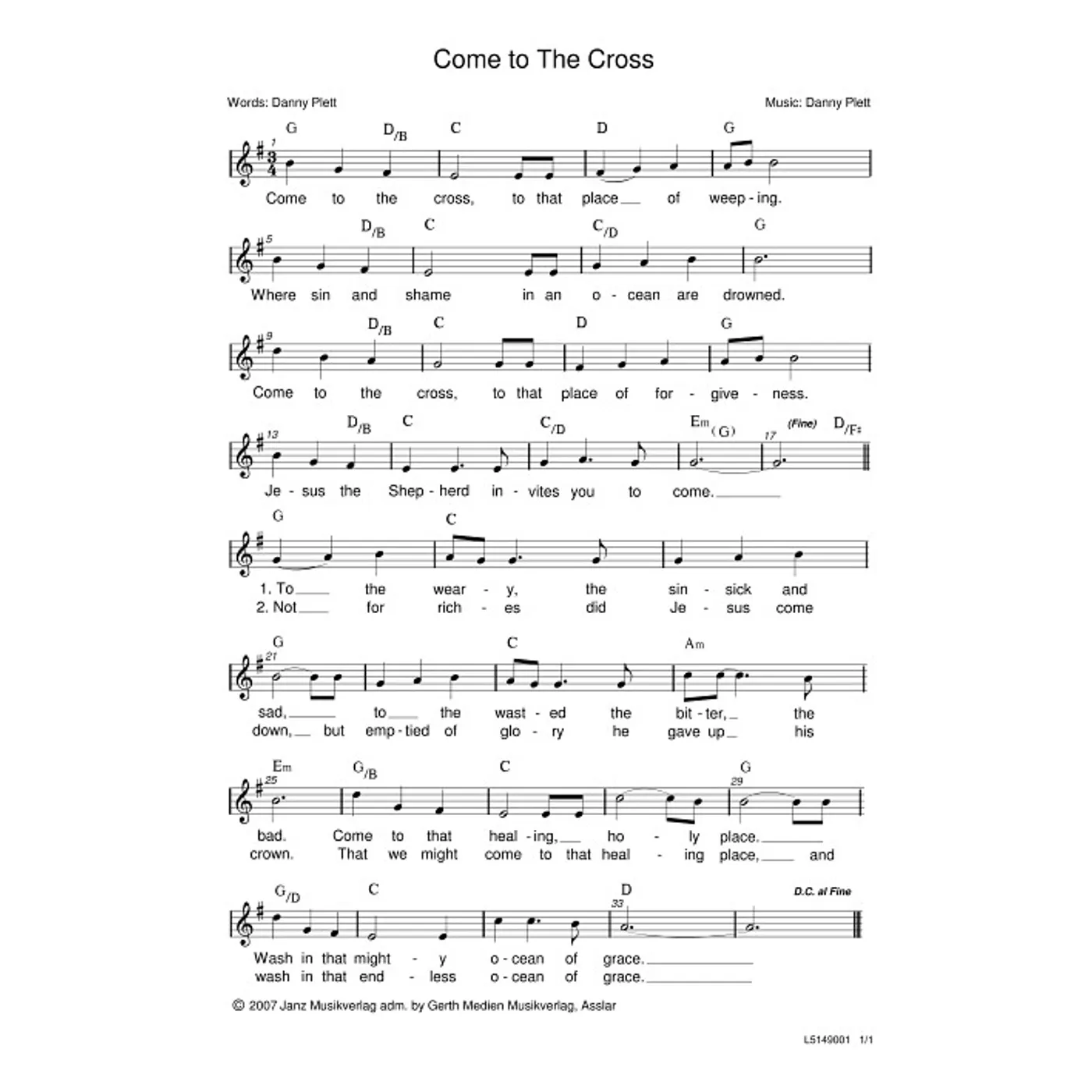 Come To The Cross (diese Variante haben Sie gerade ausgewählt) (einstimmig, mit Akkorden, G-Dur) Danny Plett (Komposition, Text) |