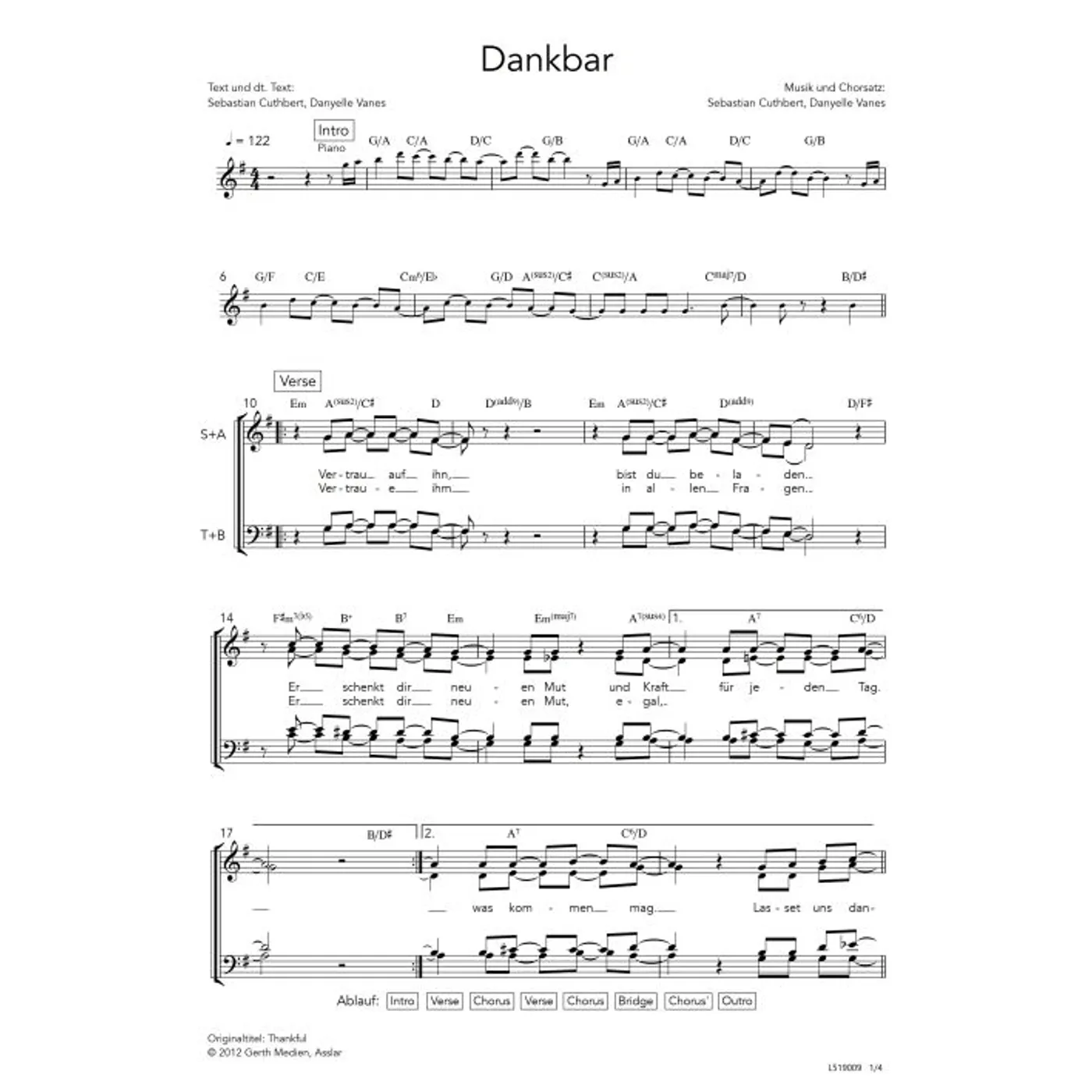 Dankbar (diese Variante haben Sie gerade ausgewählt) (gemischter Chor, mit Akkorden, vierstimmig, G-Dur) Danyelle Vanes (Komposition, Text), Sebastian Cuthbert (Text, Komposition, Chorsatz) |