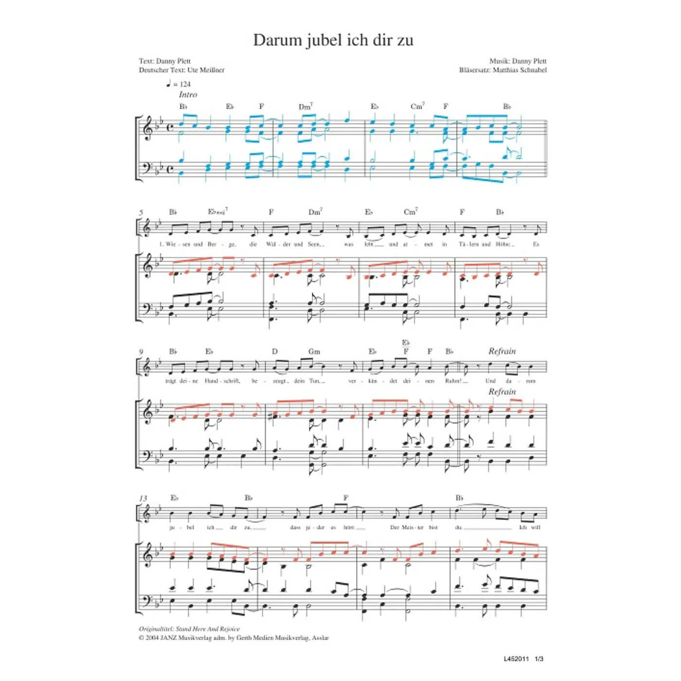 Darum jubel ich dir zu (diese Variante haben Sie gerade ausgewählt) (modern, Bläser, Bläserpartitur, Partituren, mit Akkorden, vierstimmig, B-Dur) Danny Plett (Komposition, Text, Bläsersatz), Ute Meißner (Übersetzung) |