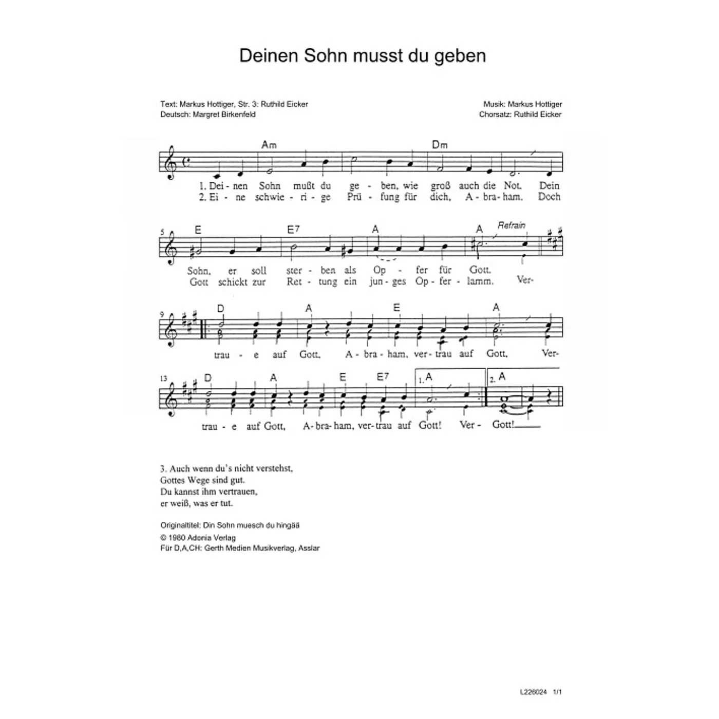 Deinen Sohn musst du geben (diese Variante haben Sie gerade ausgewählt) (einstimmig, mit Akkorden, a-moll-Moll) Markus Hottiger (Komposition, Text), Ruthild Eicker (Text, Chorsatz), Margret Birkenfeld (Übersetzung) |