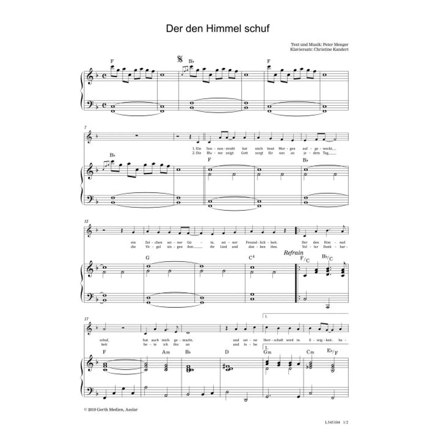 Der den Himmel schuf (diese Variante haben Sie gerade ausgewählt) (Klavier, Klavierpartitur, Partituren, dreistimmig, mit Akkorden, B-Dur) Peter Menger (Komposition, Text), Christine Kandert (Klaviersatz) |