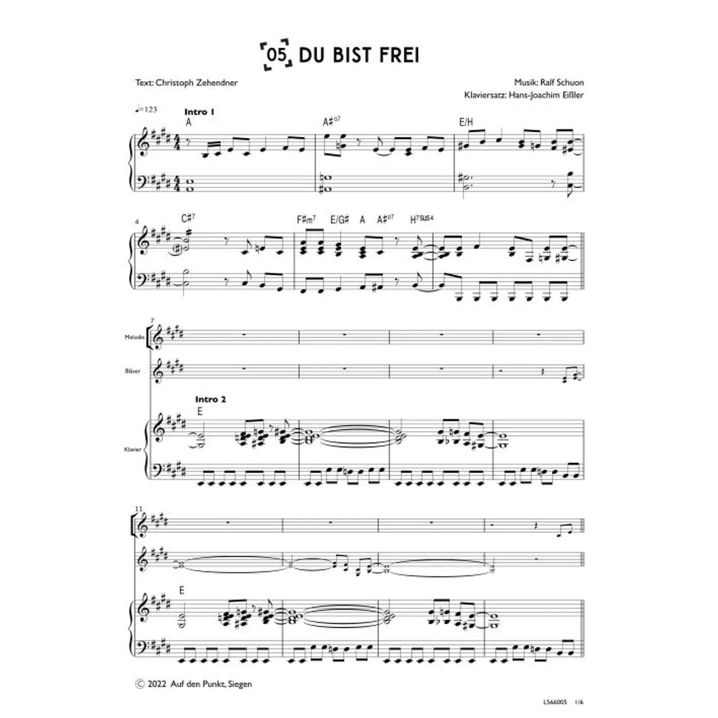 Du bist frei (Chor) (Gemeindelied, gemischter Chor, mit Akkorden, vierstimmig, E-Dur) Christoph Zehendner (Text), Hans-Joachim Eißler (Chorsatz), Ralf Schuon (Chorsatz, Komposition) | Gemeindelied, gemischter Chor, mit Akkorden, vierstimmig, E-Dur | 2,00 € | ||
