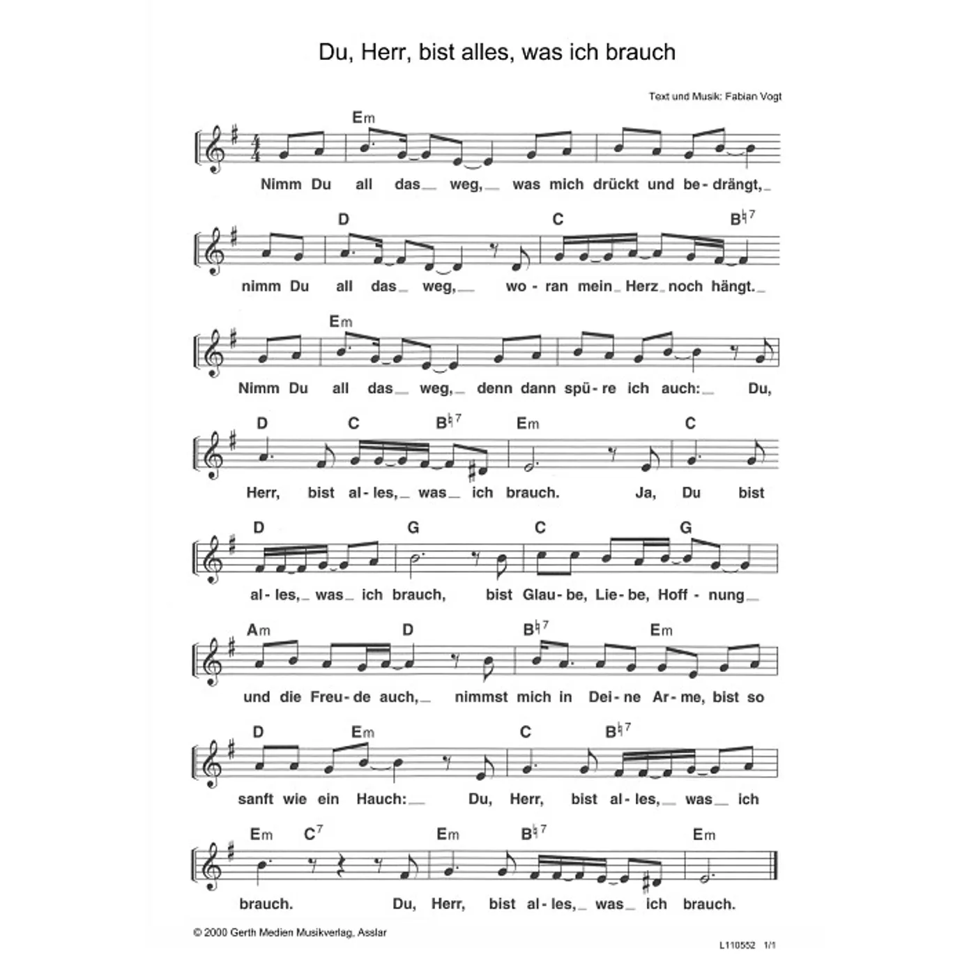 Du, Herr, bist alles, was ich brauch (diese Variante haben Sie gerade ausgewählt) (Gemeindelied, modern, einstimmig, mit Akkorden, E-Moll) Fabian Vogt (Komposition, Text) |
