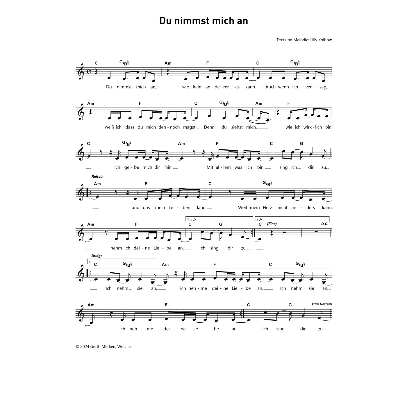 Du nimmst mich an (diese Variante haben Sie gerade ausgewählt) (Kinderlieder, einstimmig, C-Dur) Lilly Kolbow (Text, Melodie) |
