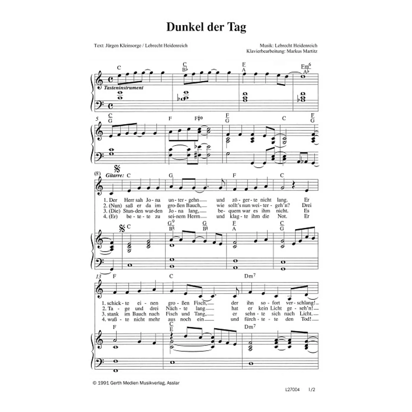 Dunkel der Tag (einstimmig, mit Akkorden, C-Dur, gleiche Reihe) Lebrecht Heidenreich (Komposition, Text), Jürgen Kleinsorge (Text) | einstimmig, mit Akkorden, C-Dur, gleiche Reihe | 1,50 € |