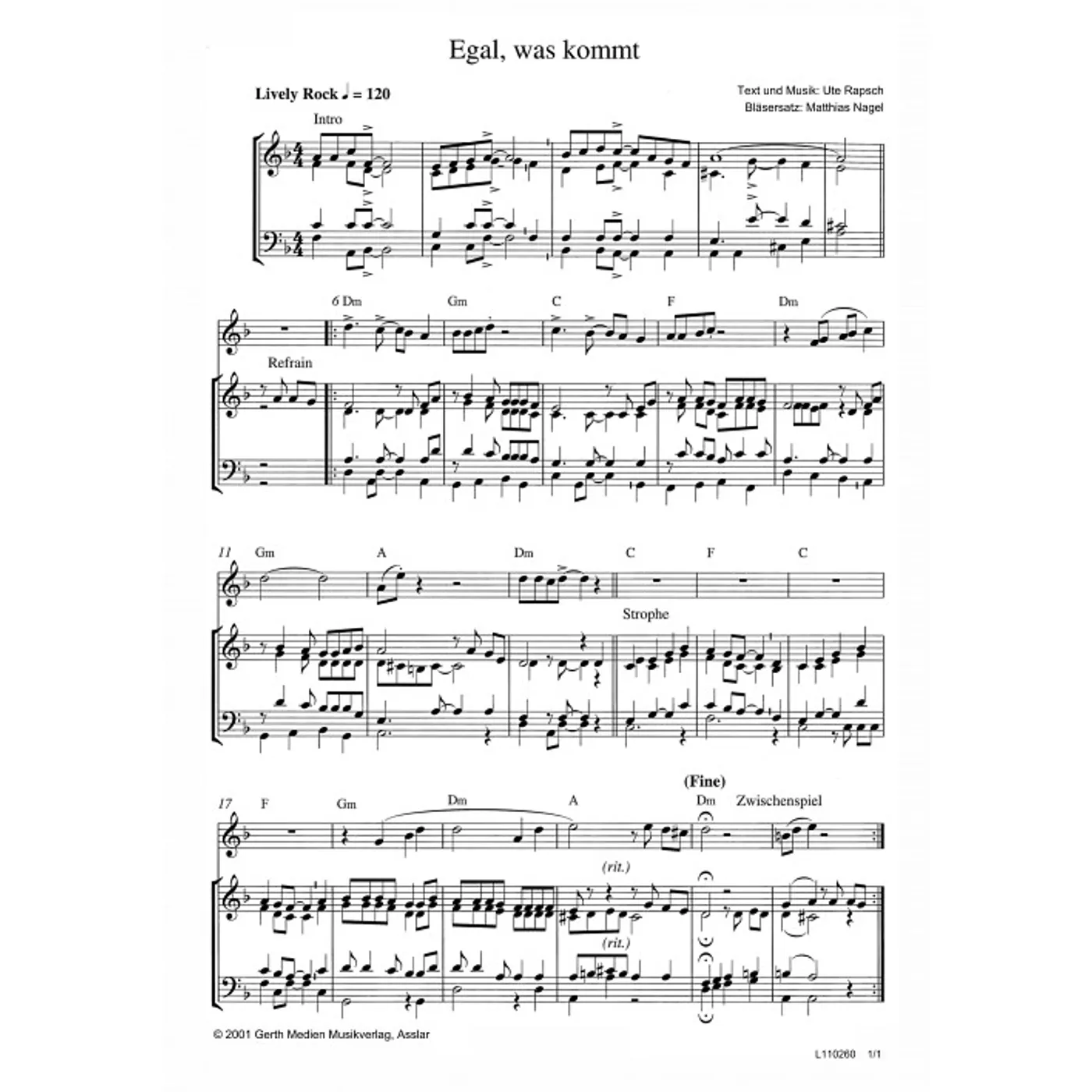 Egal was kommt (diese Variante haben Sie gerade ausgewählt) (modern, Bläser, Bläserpartitur, Partituren, mit Akkorden, vierstimmig, D-Moll) Ute Rapsch (Komposition, Text), Matthias Nagel (Bearbeiter) |