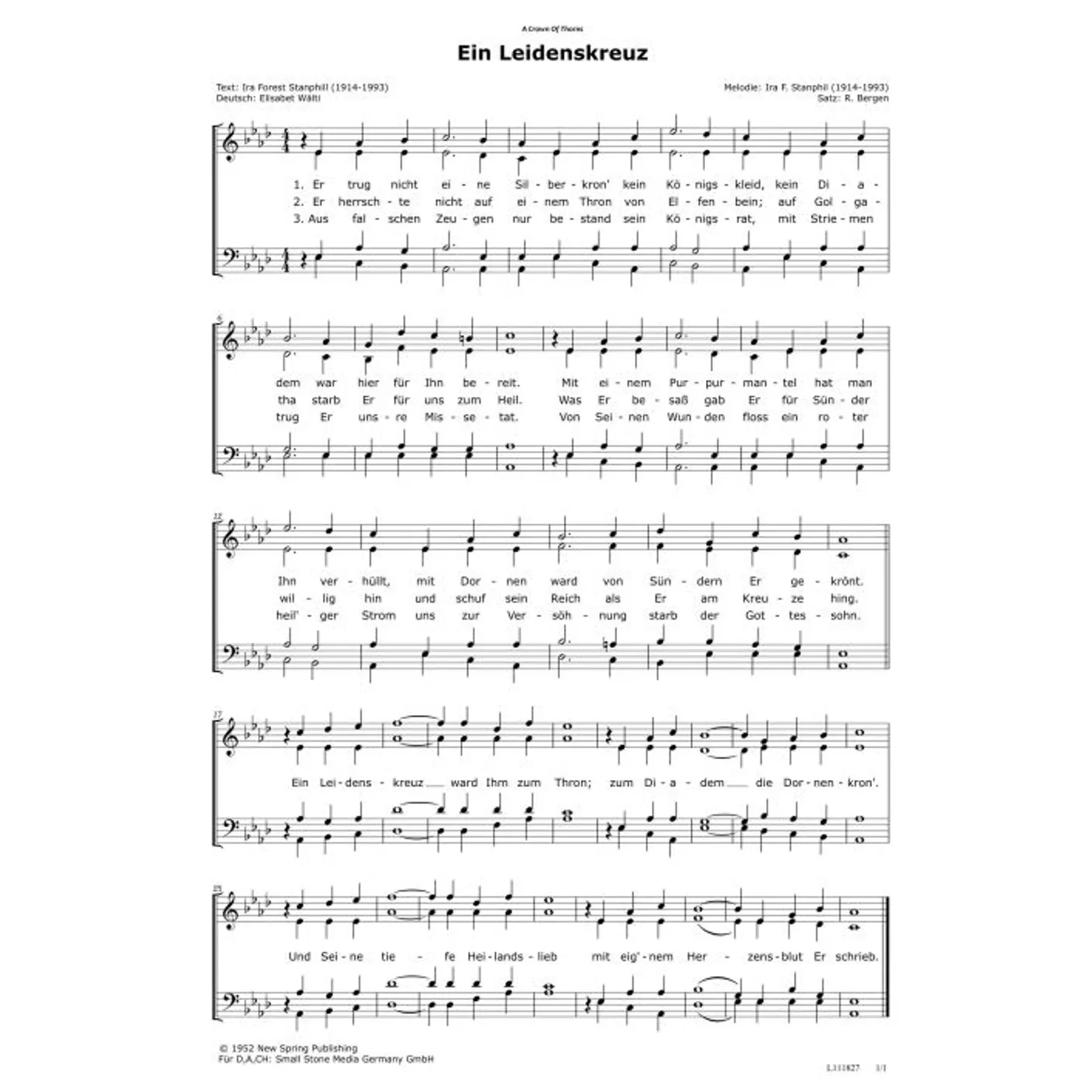 Ein Leidenskreuz (diese Variante haben Sie gerade ausgewählt) (traditionell, gemischter Chor, mit Akkorden, vierstimmig) Ira Stanphill (Komposition, Text), Rudi Bergen (Chorsatz), Elisabet Wälti (Übersetzung) |