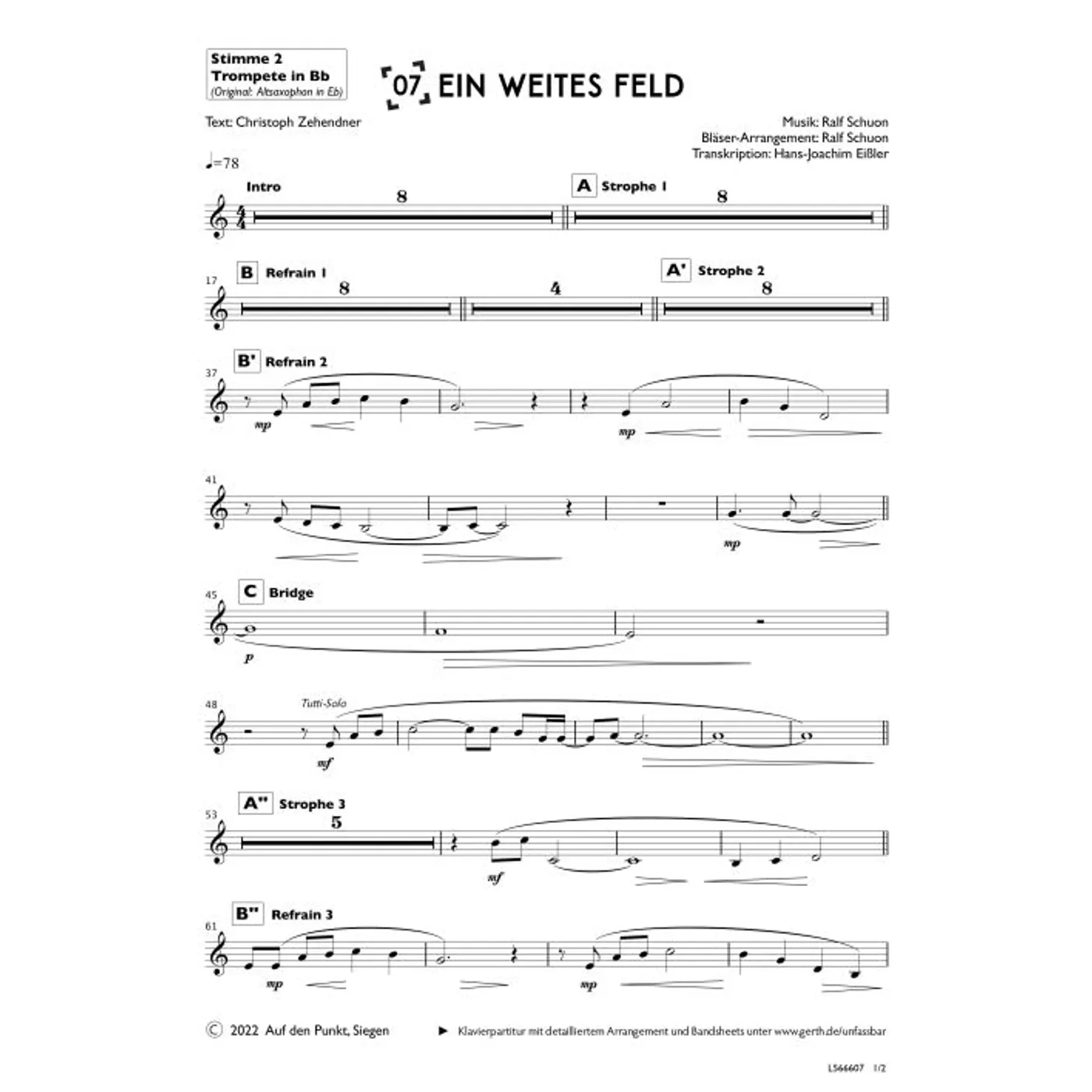 Ein weites Feld (2. Trompete in C) (Gemeindelied, Bläser, Orchestereinzelstimme, B-Dur) Christoph Zehendner (Text), Hans-Joachim Eißler (Bläsersatz), Ralf Schuon (Komposition, Bläsersatz) | Gemeindelied, Bläser, Orchestereinzelstimme, B-Dur | 2,80 € | ||
