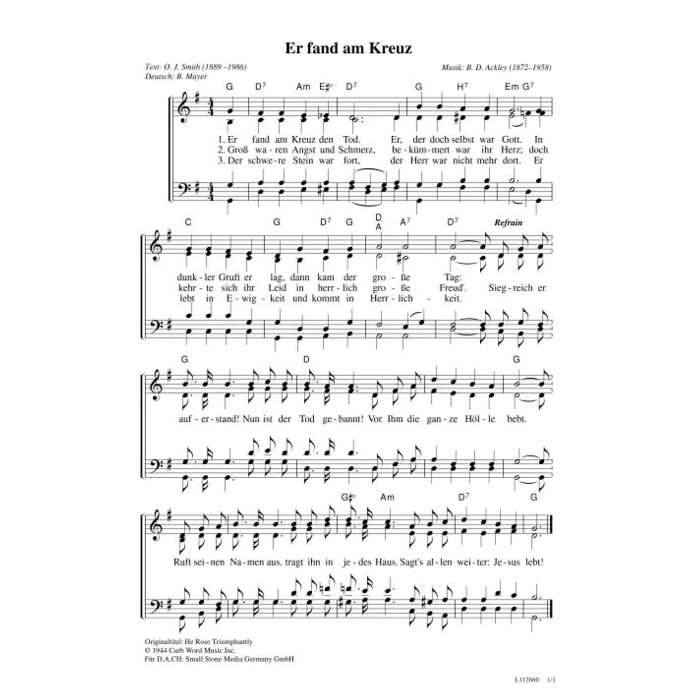 Er fand am Kreuz (diese Variante haben Sie gerade ausgewählt) (traditionell, gemischter Chor, mit Akkorden, vierstimmig, G-Dur) Bentley DeForest Ackley (Komposition), Oswald Jeffrey Smith (Text) |