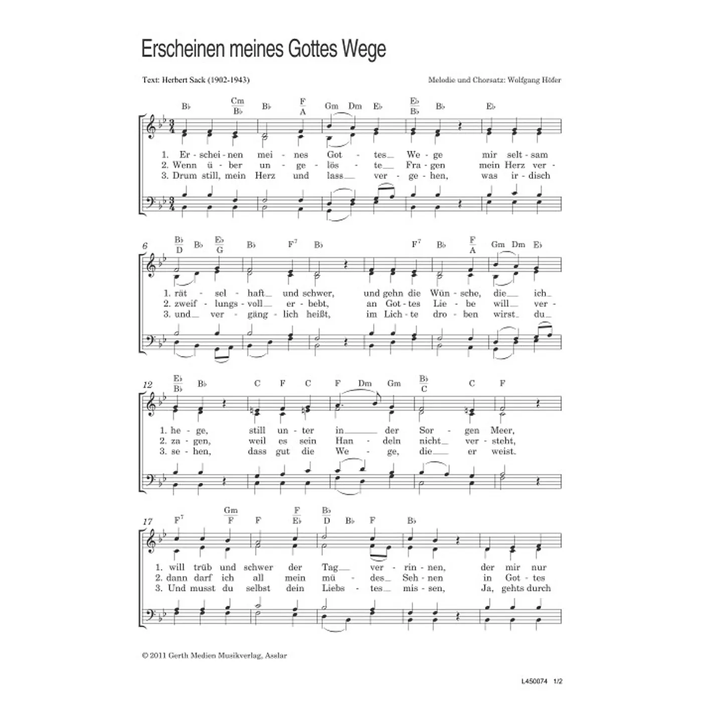 Erscheinen meines Gottes Wege (diese Variante haben Sie gerade ausgewählt) (traditionell, gemischter Chor, mit Akkorden, vierstimmig, B-Dur) Wolfgang Höfer (Komposition, Chorsatz), Herbert Sack (Text) |