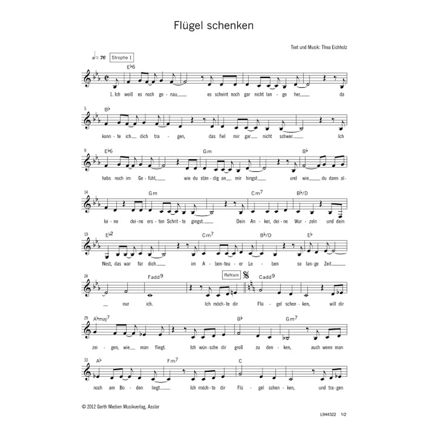 Flügel schenken (diese Variante haben Sie gerade ausgewählt) (einstimmig, mit Akkorden, Es-Dur) Thea Eichholz (Komposition, Text) |