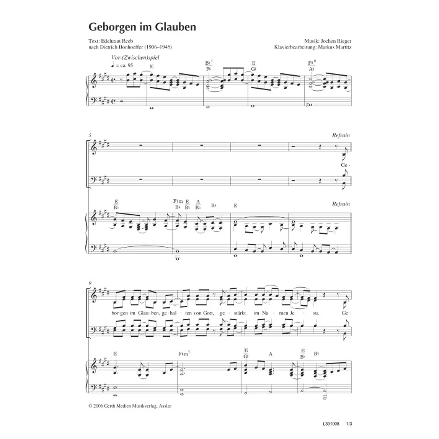Geborgen im Glauben (modern, gemischter Chor, mit Akkorden, vierstimmig, E-Dur) Edeltraut Reeb (Text), Jochen Rieger (Komposition, Bearbeiter) | modern, gemischter Chor, mit Akkorden, vierstimmig, E-Dur | 1,50 € |