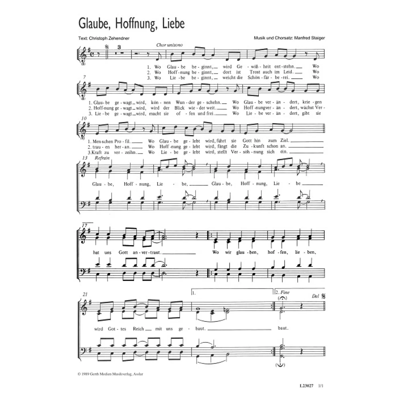 Glaube, Hoffnung, Liebe (diese Variante haben Sie gerade ausgewählt) (modern, gemischter Chor, vierstimmig, G-Dur) Manfred Staiger (Komposition), Christoph Zehendner (Text) |