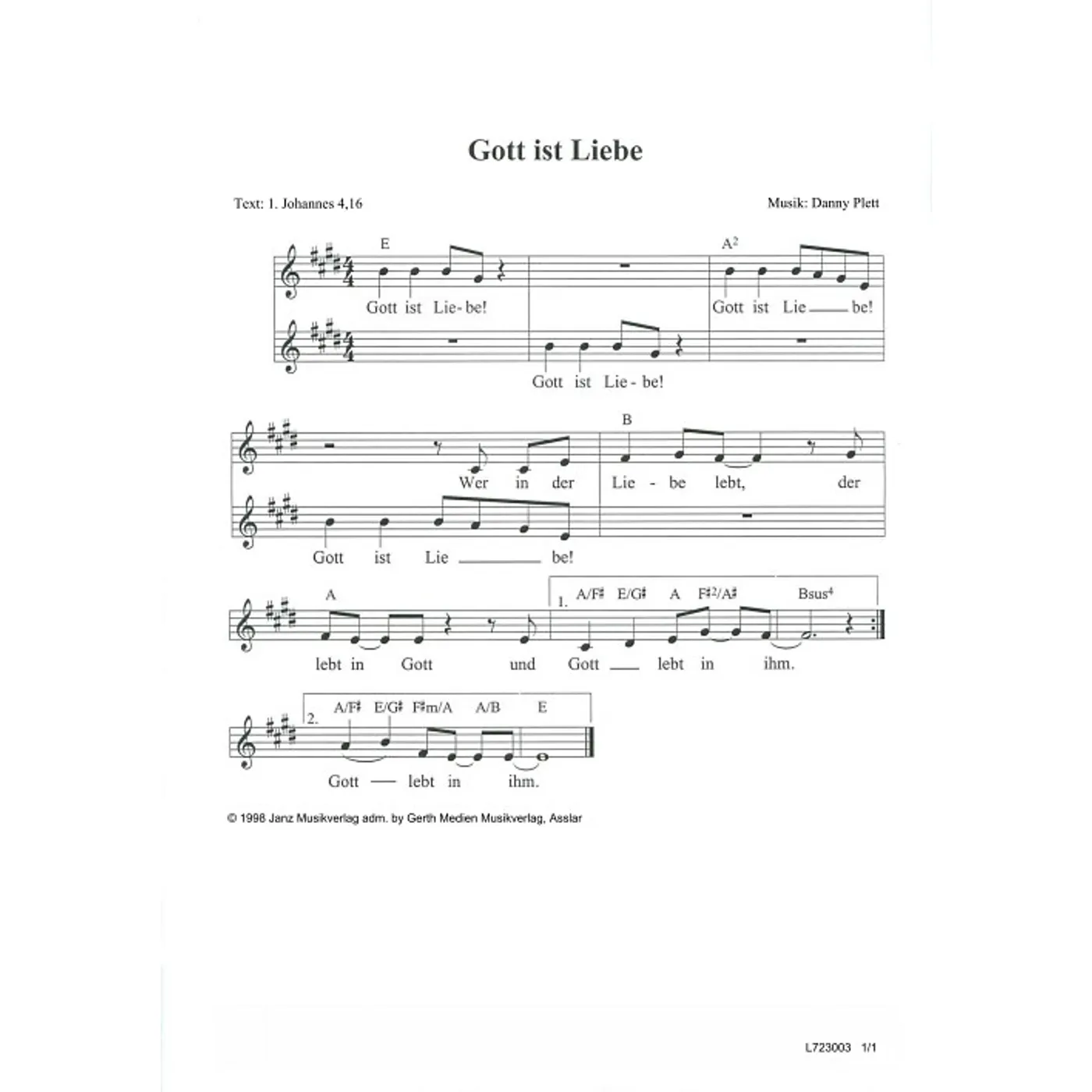 Gott ist Liebe (diese Variante haben Sie gerade ausgewählt) (einstimmig, mit Akkorden, E-Dur) Danny Plett (Komposition, Text) |