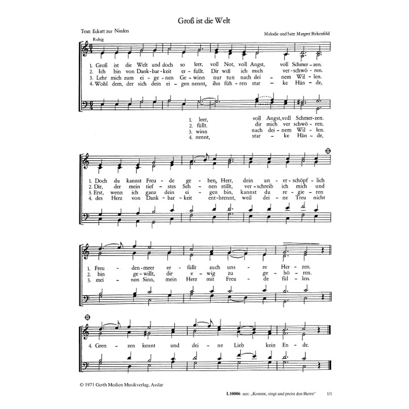 Gross ist die Welt (diese Variante haben Sie gerade ausgewählt) (traditionell, gemischter Chor, vierstimmig) Margret Birkenfeld (Komposition, Chorsatz), Eckart zur Nieden (Text) |