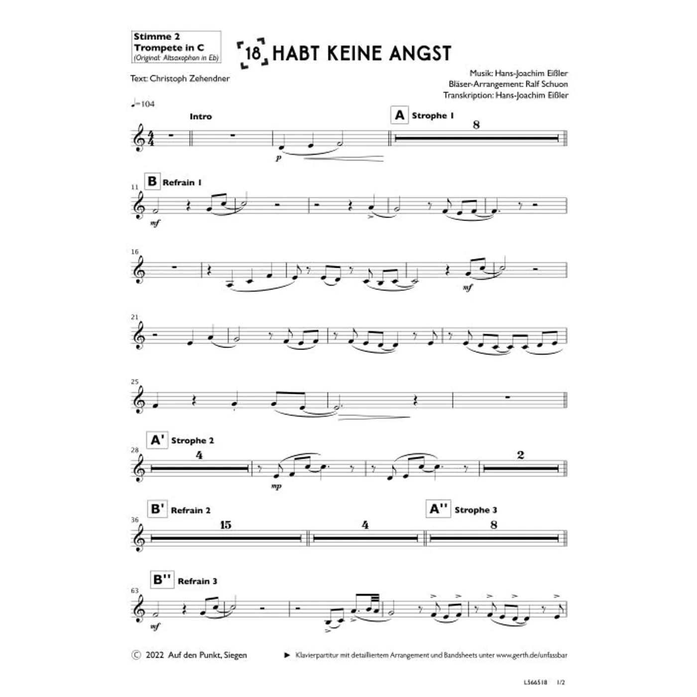 Habt keine Angst (2. Trompete in Bb) (Gemeindelied, Bläser, Orchestereinzelstimme, a-moll-Moll) Hans-Joachim Eißler (Komposition, Bläsersatz), Christoph Zehendner (Text), Ralf Schuon (Bläsersatz) | Gemeindelied, Bläser, Orchestereinzelstimme, a-moll-Moll | 2,80 € | ||