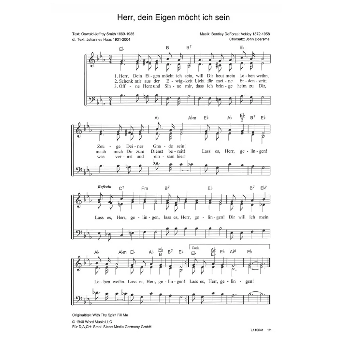 Dies ist ein Download-Artikel und kann nach dem Kauf digital heruntergeladen werden. Vorschau Bentley DeForest Ackley (Komposition) Oswald Jeffrey Smith (Text) John Boersma (Chorsatz) Johannes Haas (Übersetzung) Herr, dein Eigen möcht ich sein Gemischter Chor SATB (Noten - Download) Bitte beachten Sie: Downloads sind aktuell nur in Deutschland erhältlich. Bitte wählen Sie aus, für wie viele Kopien/Ausdrucke Sie eine Lizenz erwerben möchten. Die Lizenz wird entsprechend auf dem Dokument vermerkt. Noten - Download Weitere Varianten Alle Varianten anzeigen und vergleichen 1,50 € Sofort Lieferbar (per Download) Günstige Mengenpreise verfügbar Günstige Mengenpreise (DE) Kaufen Sie 2 zum Preis von je 1,43 € und sparen Sie 5% Kaufen Sie 10 zum Preis von je 1,35 € und sparen Sie 10% Kaufen Sie 25 zum Preis von je 1,28 € und sparen Sie 15% Kaufen Sie 50 zum Preis von je 1,20 € und sparen Sie 20% Kaufen Sie 100 zum Preis von je 1,13 € und sparen Sie 25% Lizenz pro Kopie/Ausdruck: Bestellen Sie den Artikel jetzt auf: Informationen zur Lizenz Details Erscheinungstermin: 30.06.2015 Verlag: Small Stone Media Artikel-Nr.: W80028602 Originaltitel: With Thy Spirit Fill Me Tonart: Es-Dur Stil/Genre: traditionell Satz: gemischter Chor, mit Akkorden, vierstimmig Seitenzahl: 1 S. Hinweise: DIN A4 Dateigröße insg.: 261,9 Kilobyte Dieses Produkt ist preisgebunden: Ja Download-Material: L110641 (PDF) Angaben zum Hersteller nach GPSR: Gerth Medien i.d. SCM Verlagsgruppe GmbH Berliner Ring 62 35576 Wetzlar DEUTSCHLAND info@scm-verlagsgruppe.de Weitere Details Weitere Varianten Noten-Downloads Herr, dein Eigen möcht ich sein (diese Variante haben Sie gerade ausgewählt) (traditionell, gemischter Chor, mit Akkorden, vierstimmig, Es-Dur) Bentley DeForest Ackley (Komposition), Oswald Jeffrey Smith (Text), John Boersma (Chorsatz), Johannes Haas (Übersetzung) traditionell, gemischter Chor, mit Akkorden, vierstimmig, Es-Dur 1,50 € Herr, dein Eigen möcht ich sein (traditionell, Klavier, gemischter Chor, mit Akkorden, vierstimmig, Es-Dur) Bentley DeForest Ackley (Komposition), Oswald Jeffrey Smith (Text), John Boersma (Chorsatz), Johannes Haas (Übersetzung) traditionell, Klavier, gemischter Chor, mit Akkorden, vierstimmig, Es-Dur 2,80 € Die Preise stellen die Einzelpreise der jeweils verfügbaren Einzeldownloads dar. Bewertungen Für dieses Produkt gibt es noch keine Rezensionen. Weitere Artikel von Bentley DeForest Ackley zur Produktseite von Er fand am Kreuz Er fand am Kreuz Noten - Download 1,50 € Download zur Produktseite von Herr, dein Eigen möcht ich sein Herr, dein Eigen möcht ich sein Noten - Download 2,80 € Download zur Produktseite von Jesus Christus kommt bald wieder Jesus Christus kommt bald wieder Noten - Download 3,80 € Download Alle Artikel von Bentley DeForest Ackley anzeigen Das könnte Sie auch interessieren zur Produktseite von Ob alles wankt Ob alles wankt Noten - Download 3,80 € Download