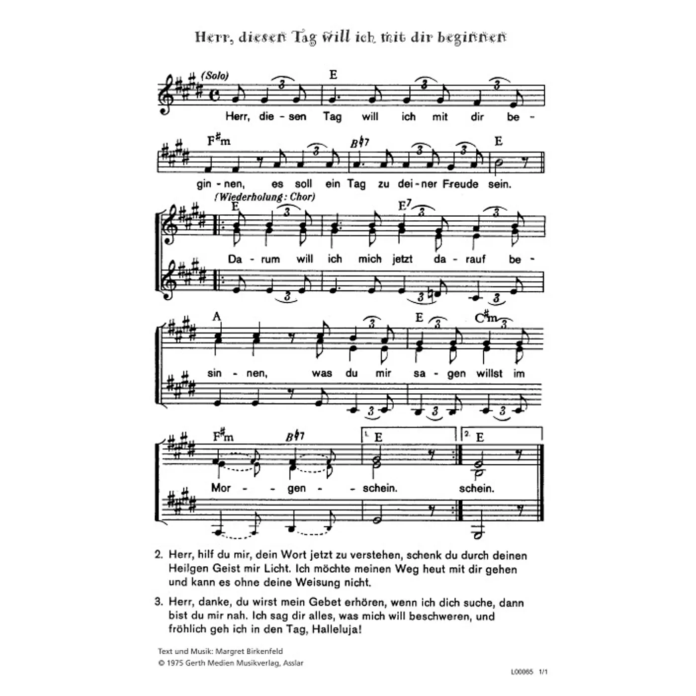 Herr, diesen Tag will ich mit dir beginnen (diese Variante haben Sie gerade ausgewählt) (Kinderchor, Solostimme, dreistimmig, mit Akkorden, E-Dur) Margret Birkenfeld (Komposition, Text, Chorsatz) |