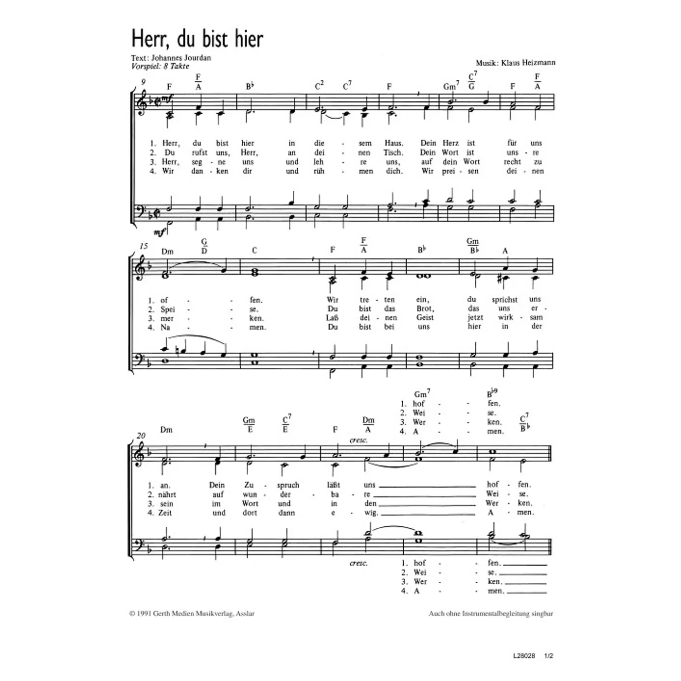 Herr, du bist hier (diese Variante haben Sie gerade ausgewählt) (traditionell, gemischter Chor, mit Akkorden, vierstimmig, F-Dur) Johannes Jourdan (Text), Klaus Heizmann (Chorsatz, Komposition) |