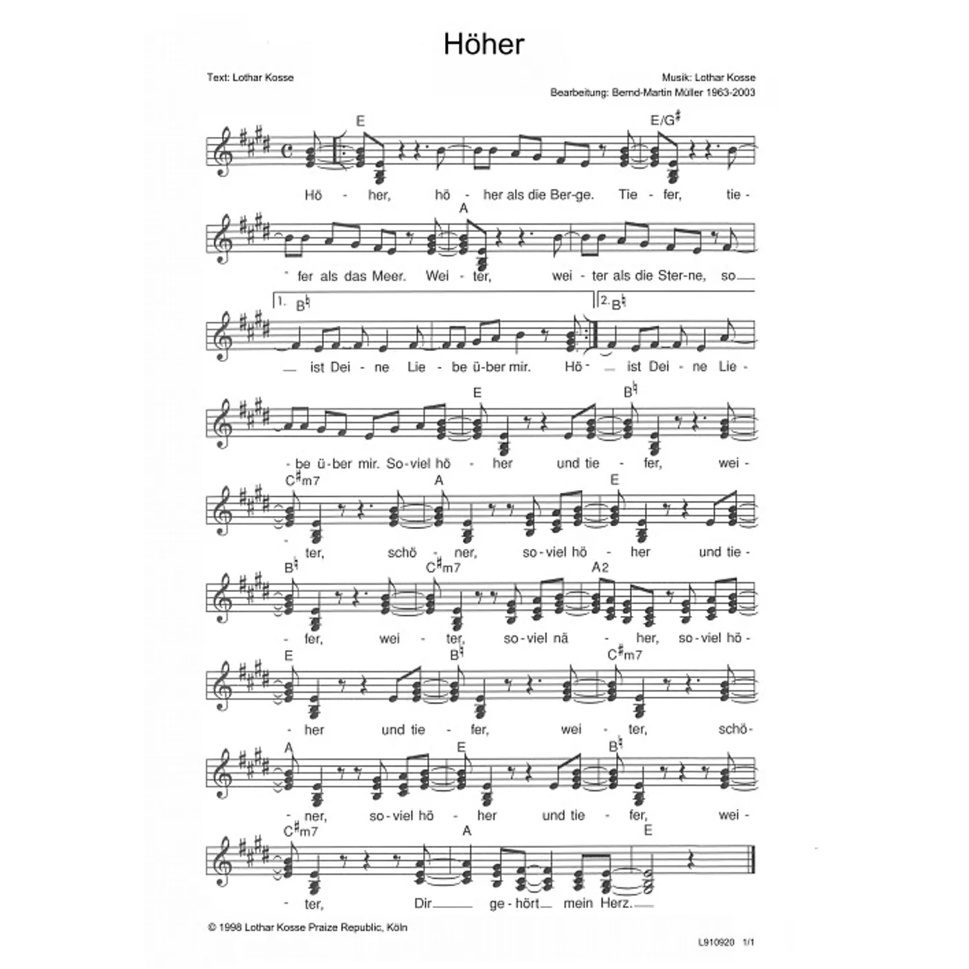 Höher (diese Variante haben Sie gerade ausgewählt) (modern, dreistimmig, mit Akkorden, E-Dur) Lothar Kosse (Komposition, Text), Bernd-Martin Müller (Bearbeiter) |