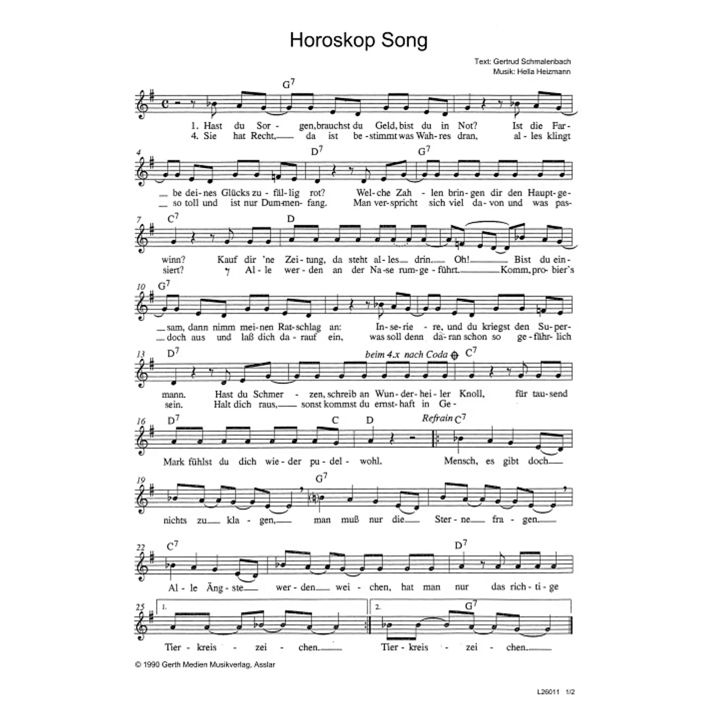 Horoskop-Song (diese Variante haben Sie gerade ausgewählt) (einstimmig, mit Akkorden, G-Dur) Hella Heizmann (Komposition), Gertrud Schmalenbach (Text) |
