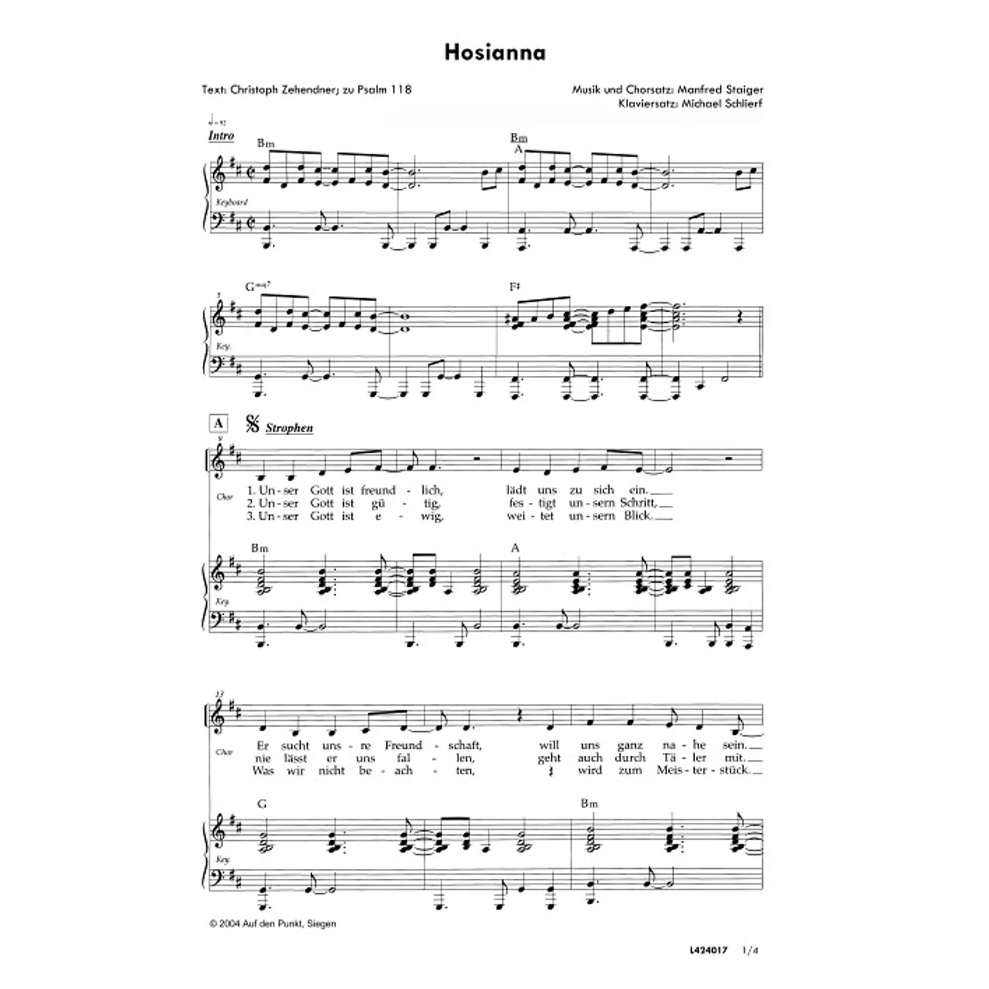 Hosianna (diese Variante haben Sie gerade ausgewählt) (modern, Klavier, gemischter Chor, mit Akkorden, vierstimmig, h-Moll) Christoph Zehendner (Text), Manfred Staiger (Chorsatz, Komposition), Michael Schlierf (Klaviersatz) |