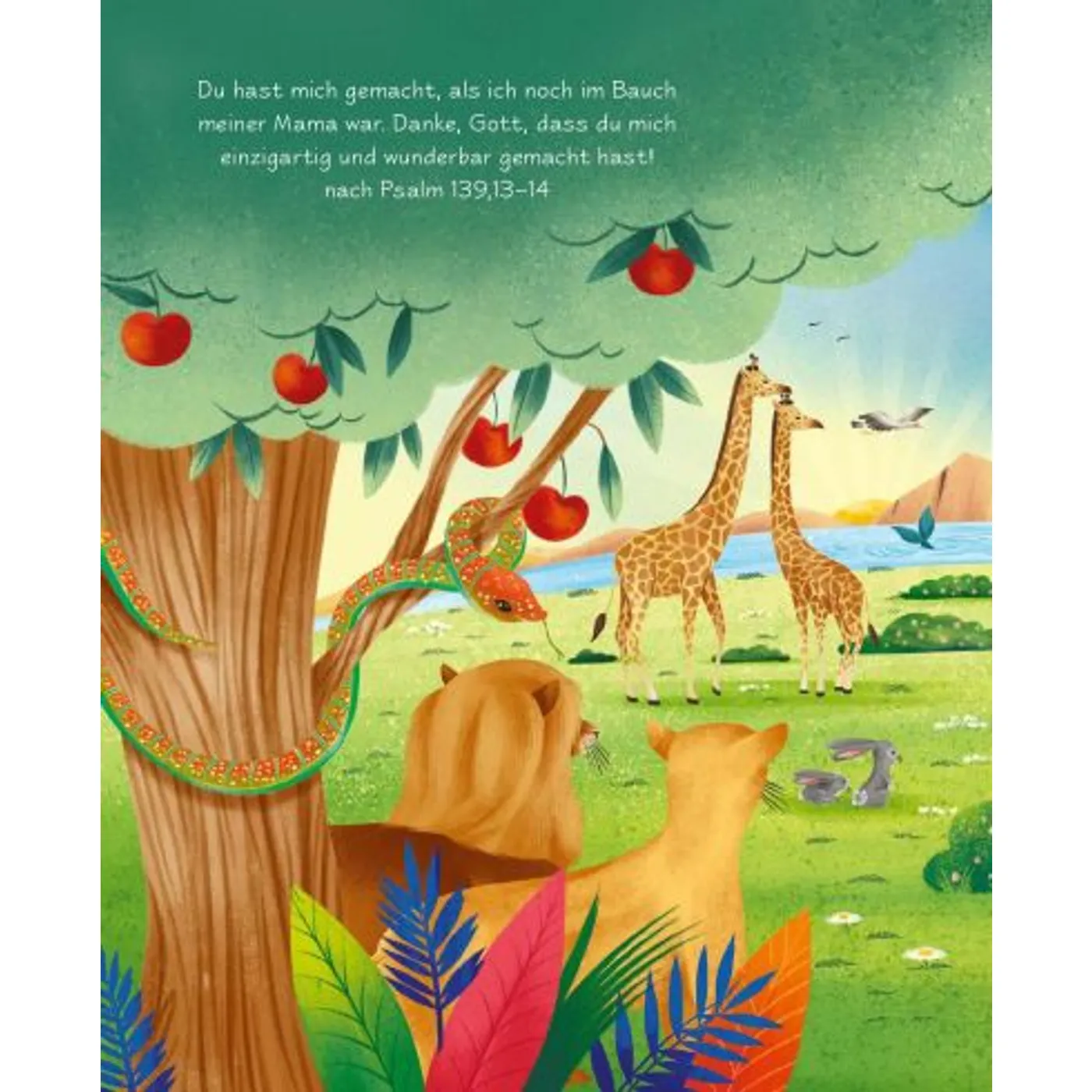 Das großformatige Kinderbuch arbeitet Geschichte aus der Bibel auf. Die wunderschönen farbenfrohen und ganzseitigen Illustrationen fallen sofort ins Auge. Die Hintergrundfarben sind dabei meist sehr zart gewählt. Die Texte sind gekonnt in die Zeichnungen integriert.