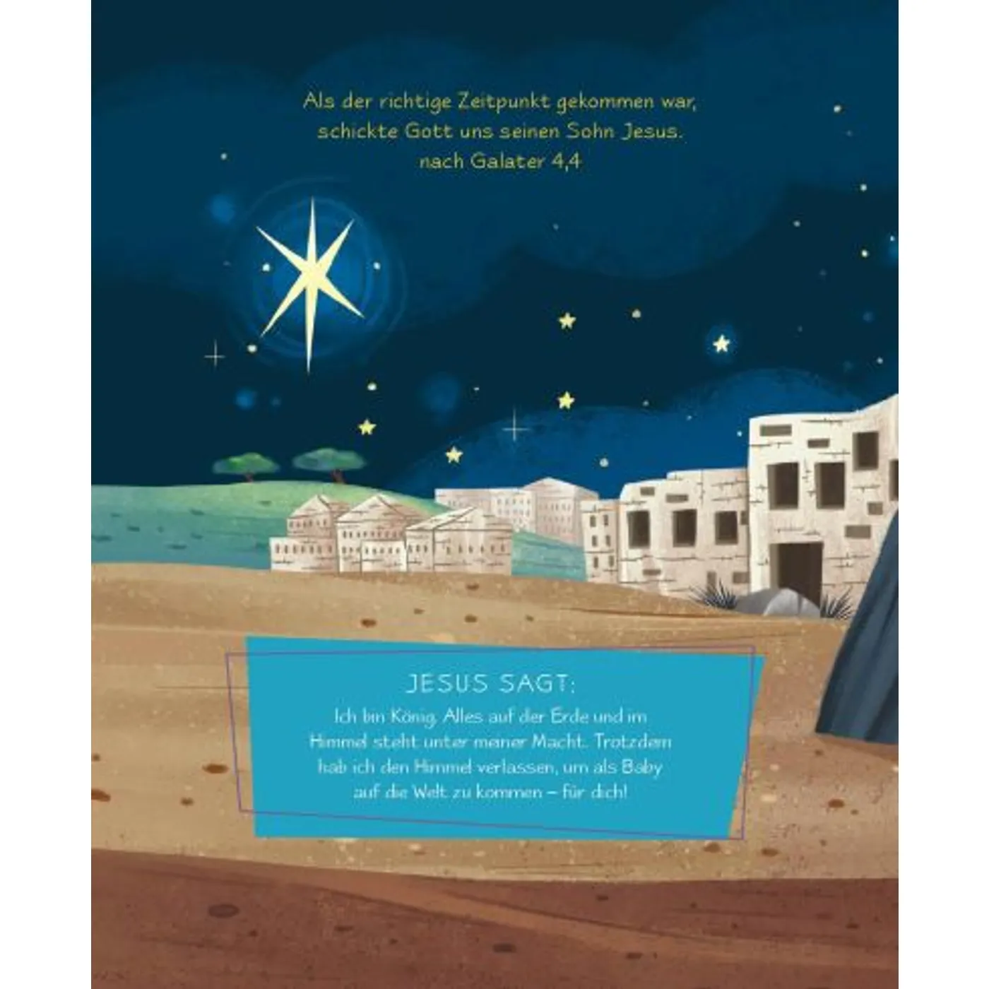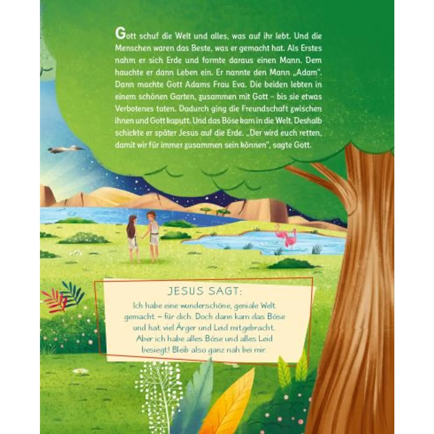 Auf zwölf Doppelseiten werden Themen wie wie Erschaffung des Menschen, der Sündenfall, die Geburt Jesu, Jesu Wirken, die Auferweckung des Lazarus und das Ostergeschehen auf kindgerechte Art dargestellt. Obiges Zitat zeigt, dass die Texte in verständliche Form formuliert sind. Sie sind meist kurz und in großer Schrft. Dabei folgt der Aufbau der Seiten immer dem gleichen Schema.