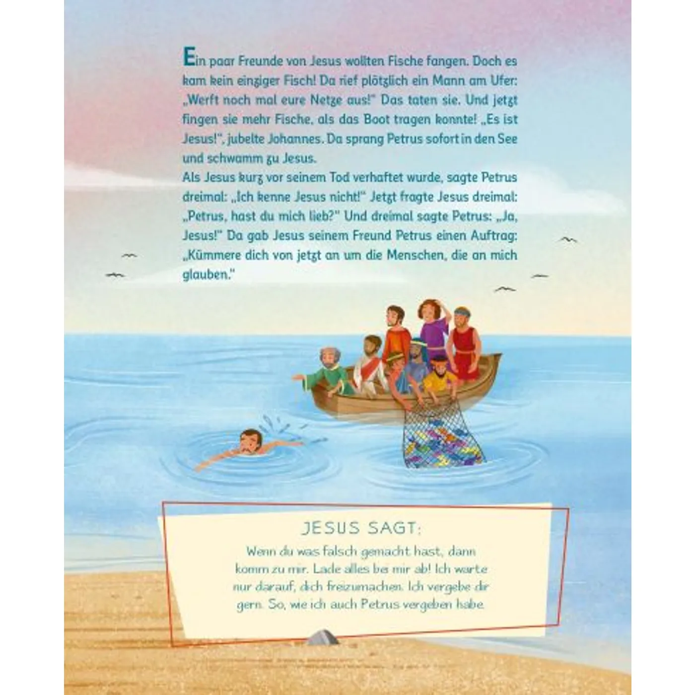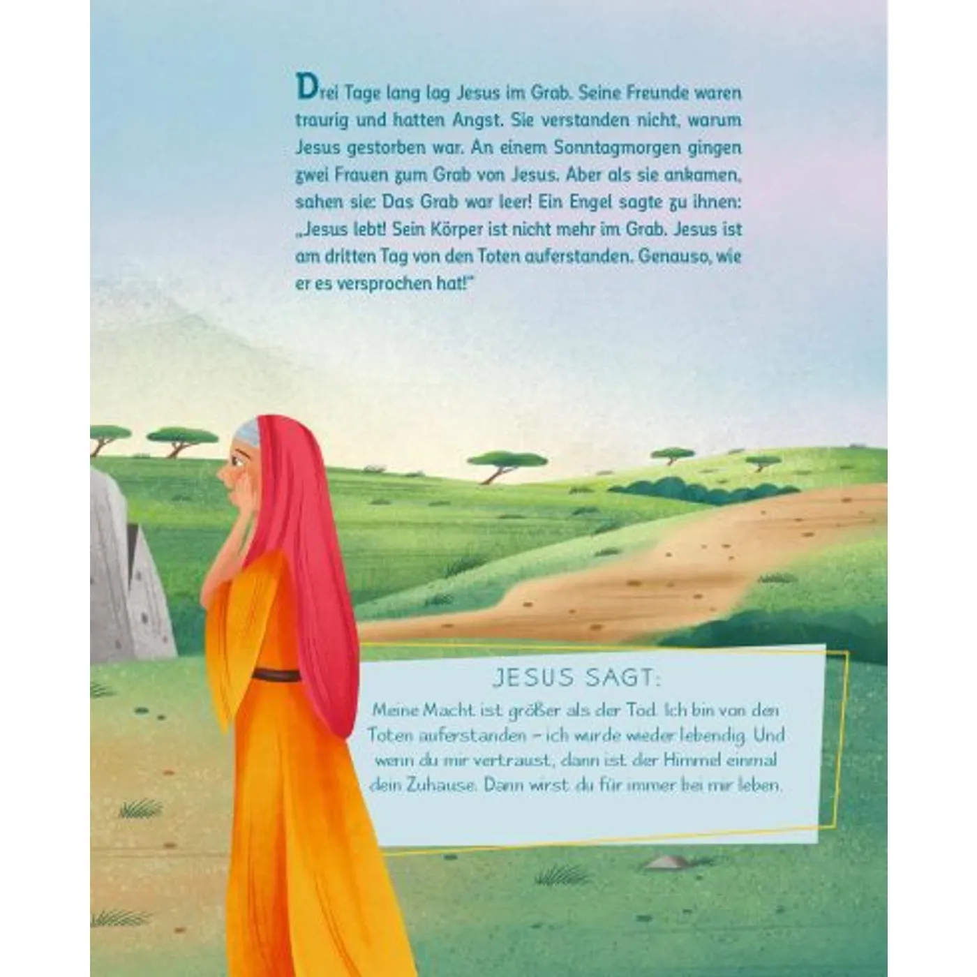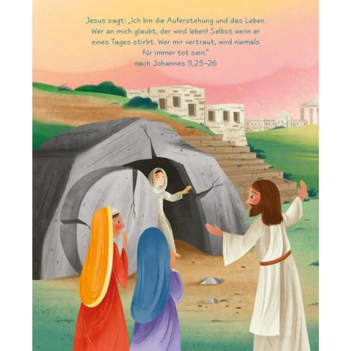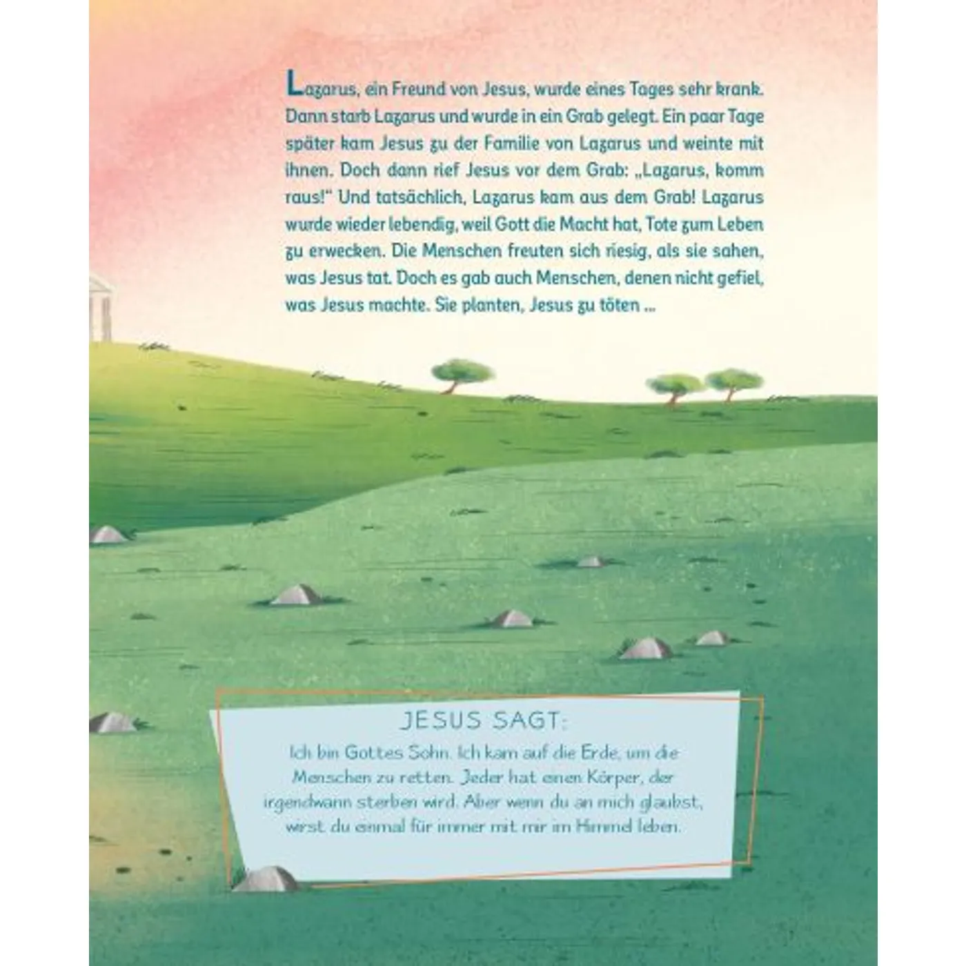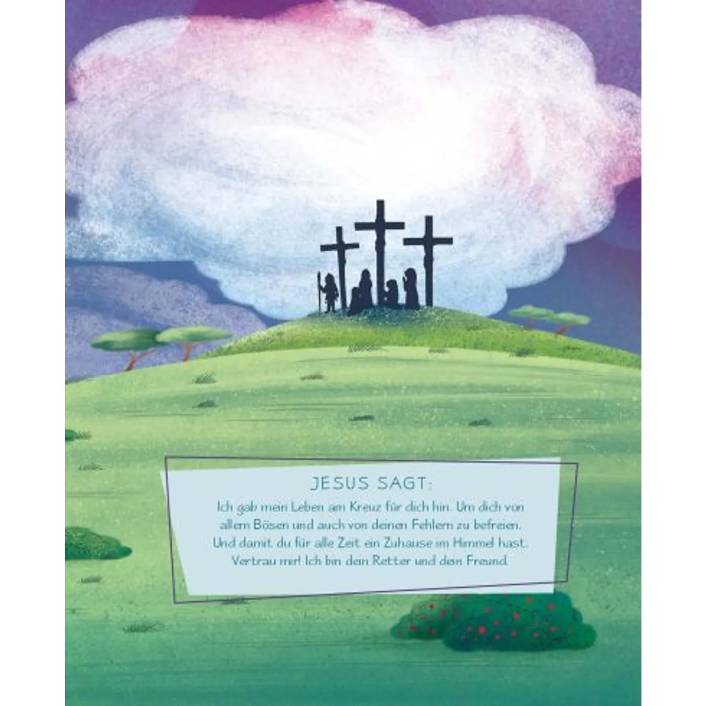 Unsere Meinung: Aufgrund des Titels hatten wir mit einem etwas anderen Inhalt gerechnet. Doch dieses Buch beginnt damit, wie Gott die Erde und Adam und Eva schuf. Weiter werden wir geleitet über Josef hin zu Propheten wie Jona. Die Geburt Jesus war natürlich unser erstes Highlight, da sie uns an letztes Weihnachten erinnert hat. Es finden dann noch Lazarus, die Kreuzigung, das leere Grab, Begegnung mit den Jüngern usw. Platz. Dazu möchten wir anmerken, dass die einzelnen Bibelstellen mit eigenen Worten der Autorin erklärt und dann nochmals in einem Kästchen mit Jesus sagt unterstrichen werden. Das alles findet auf einer wunderschön illustrierten Doppelseite Platz. Die Zeichnungen sind farbenfroh, absolut ansprechend und kindgerecht gestaltet und reichen über beide Seiten. Auch die Erwachsenen waren davon begeistert ob der ansprechenden Gestaltung. Abgerundet wird das Buch mit einem Vorwort für die Eltern und Großeltern und den Abschluss bildet ein berührender Brief von Jesus an die Kinder. Aufgrund unserer Erwartungshaltung dem Titel geschuldet - haben wir eine noch intensivere Auseinandersetzung mit der Karzeit vermisst, wie den Palmsonntag, das letzte Abendmahl, den Kreuzweg,... Gerne hätten wir es noch intensiver mit dem Buch erlebt, noch dazu, wo dieses so schön gestaltet und aufgearbeitet ist.