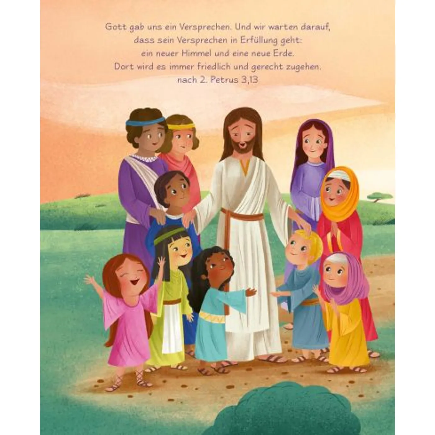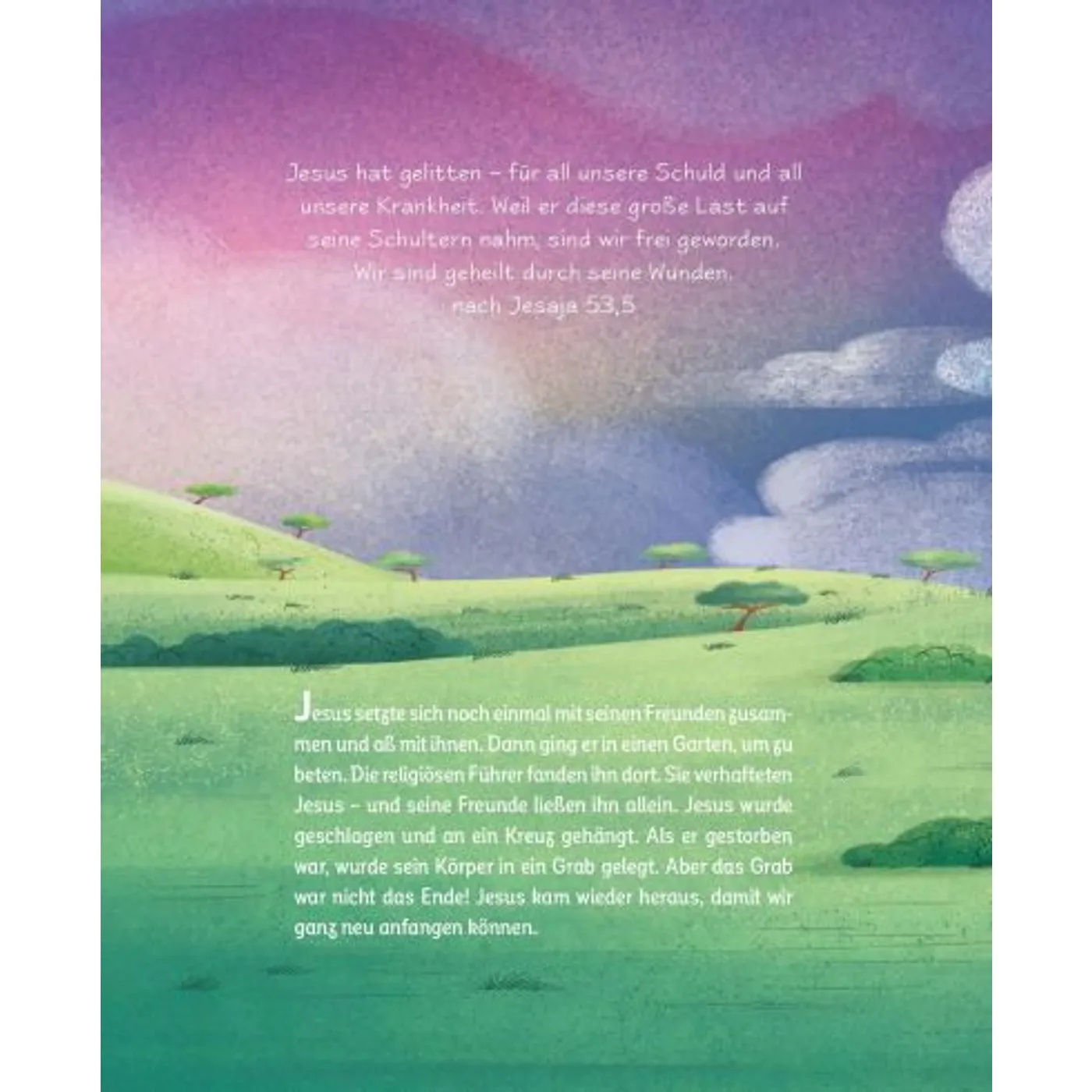 Auf der letzten Seite befindet sich ein persönlicher Brief von Jesus an die Kinder. Dazu passt das Bild der aufgehenden Sonne und die zarten Farbtöne in Grün, Rosa und Blau.