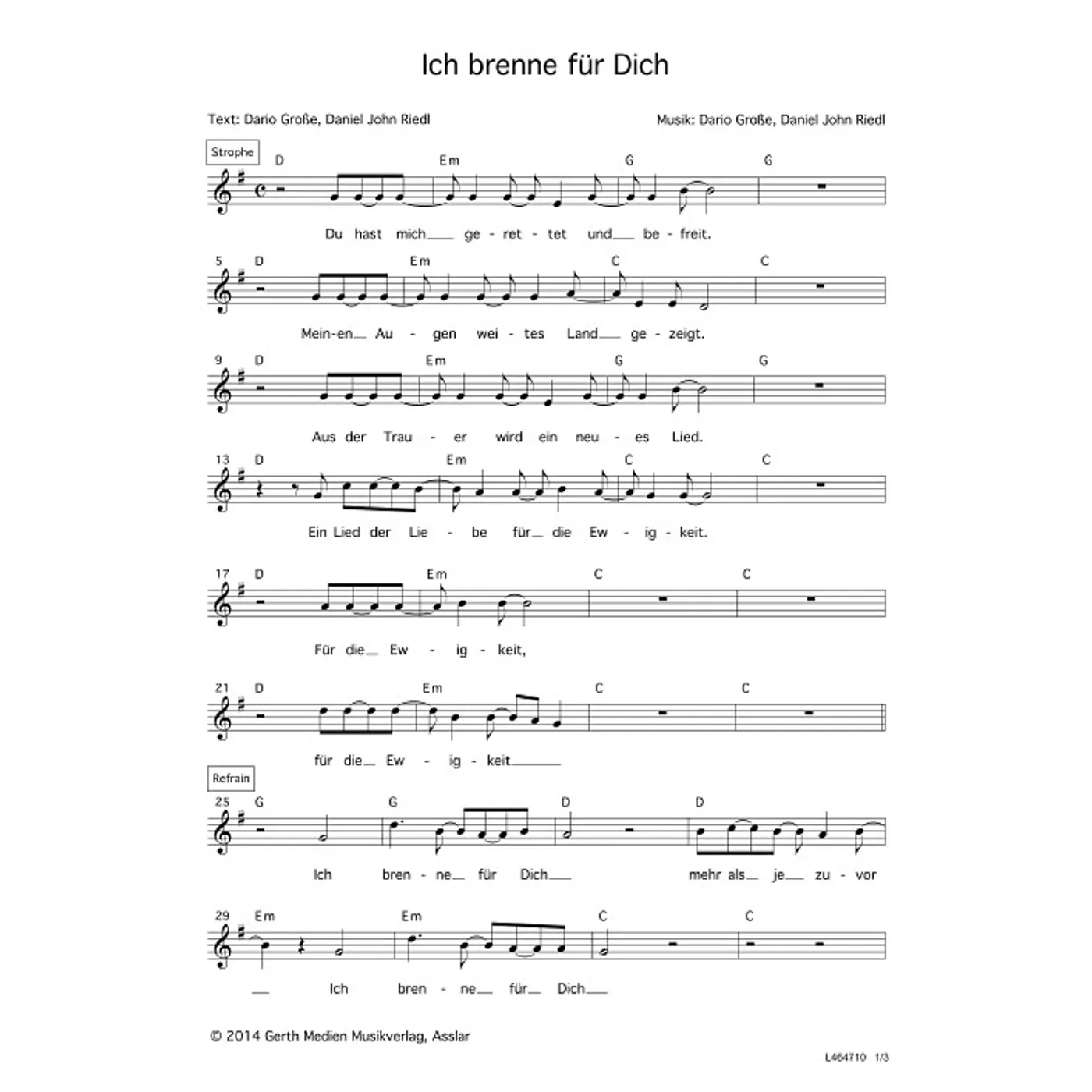 Ich brenne für dich (diese Variante haben Sie gerade ausgewählt) (modern, einstimmig, mit Akkorden, D-Dur) Dario Große (Komposition, Text), Daniel-John Riedl (Komposition, Text) |