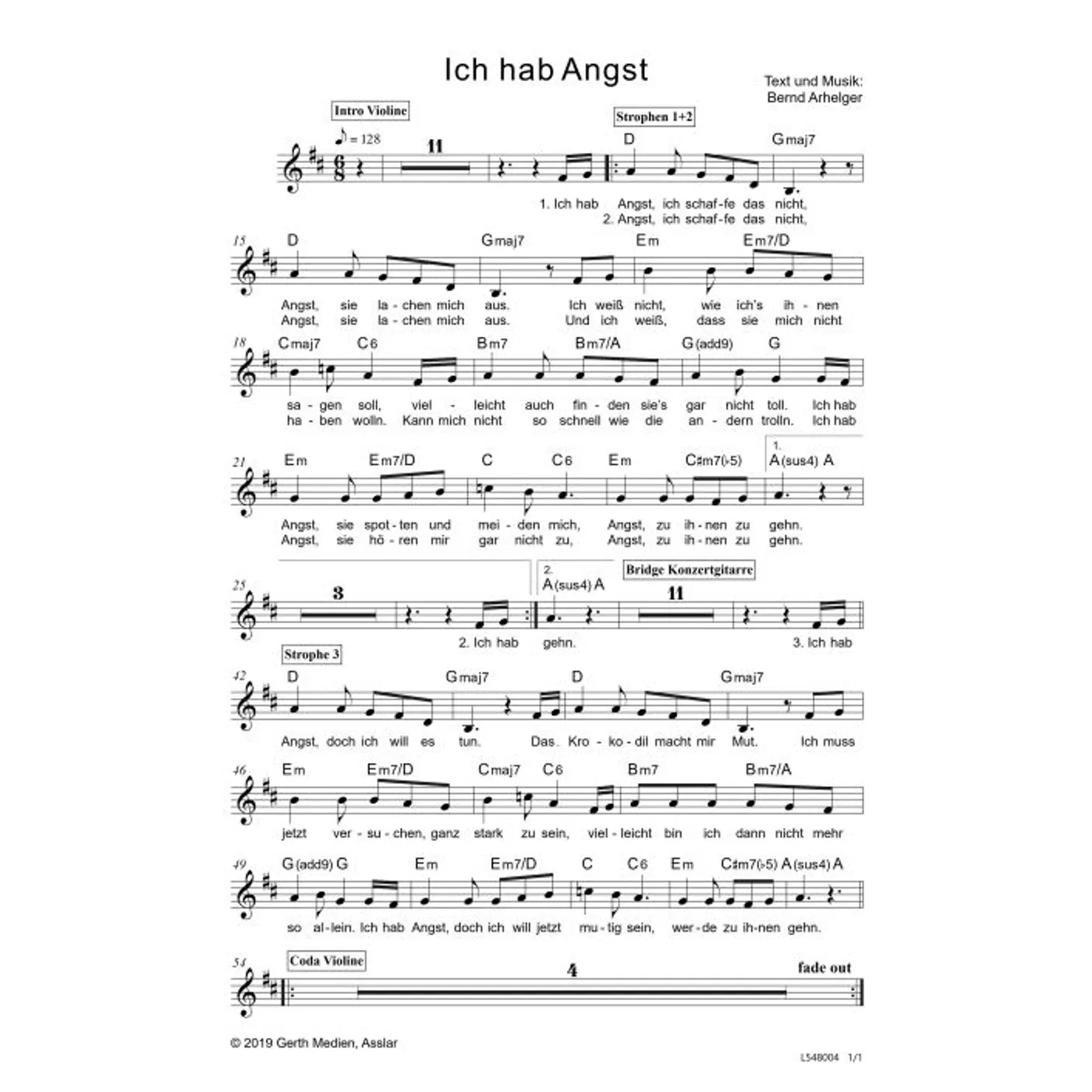 Ich hab Angst (Kinderchor, Klavier, einstimmig, mit Akkorden, D-Dur, gleiche Reihe) Bernd Arhelger (Klaviersatz) | Kinderchor, Klavier, einstimmig, mit Akkorden, D-Dur, gleiche Reihe | 3,80 € |