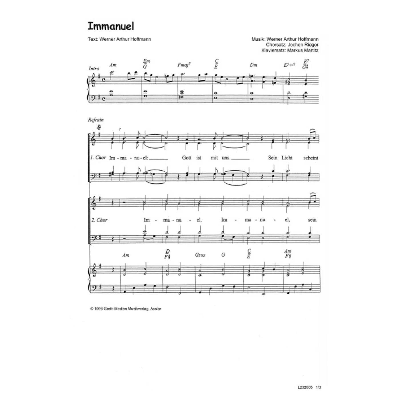 Immanuel (diese Variante haben Sie gerade ausgewählt) (Klavier, gemischter Chor, mit Akkorden, vierstimmig, a-moll-Moll) Werner A. Hoffmann (Komposition, Text), Jochen Rieger (Chorsatz), Markus Martitz (Klaviersatz) |