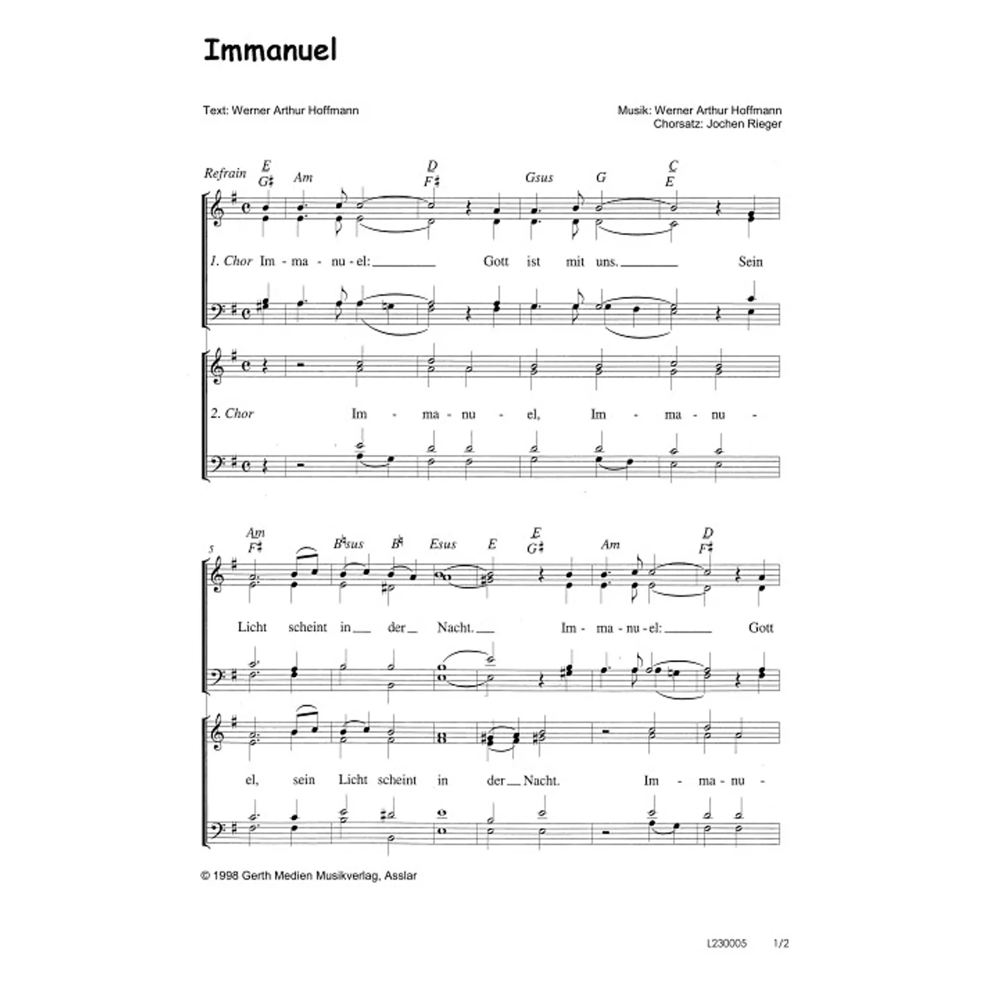 Immanuel (diese Variante haben Sie gerade ausgewählt) (gemischter Chor, mit Akkorden, G-Dur) Werner A. Hoffmann (Komposition, Text), Jochen Rieger (Bearbeiter) |