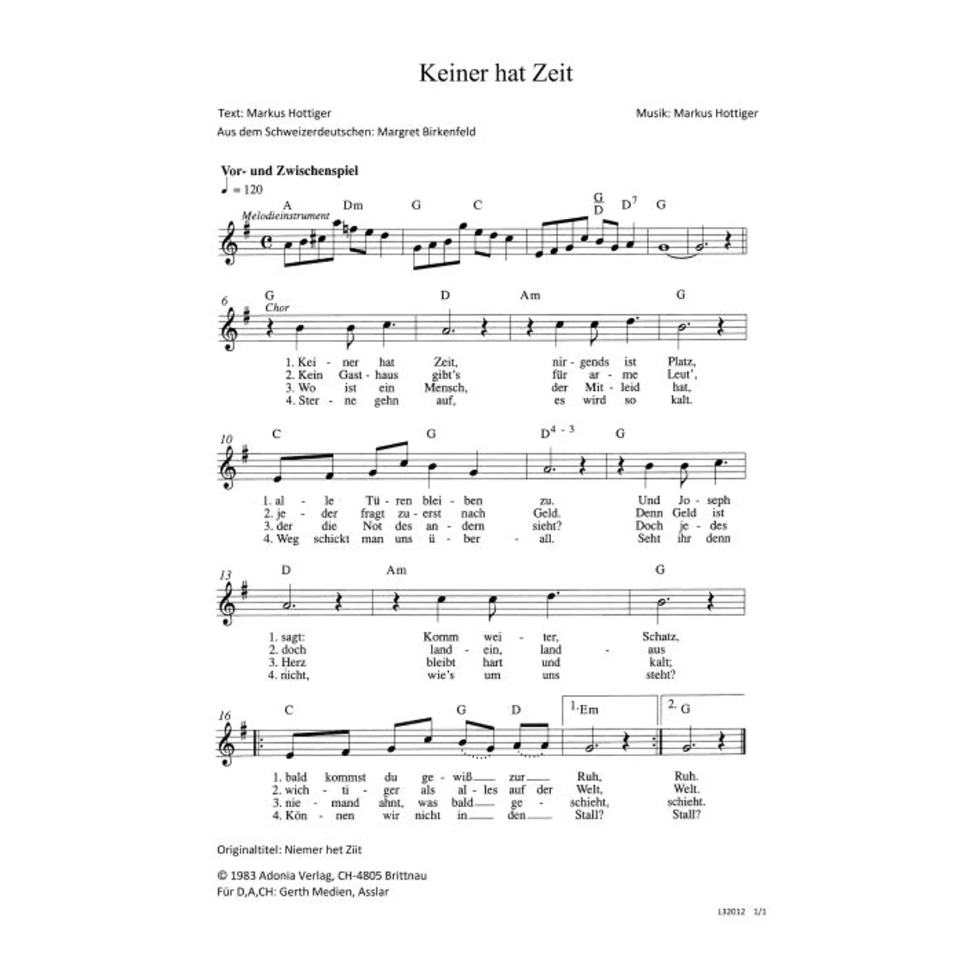 Keiner hat Zeit (diese Variante haben Sie gerade ausgewählt) (einstimmig, mit Akkorden, G-Dur) Markus Hottiger (Text, Komposition), Margret Birkenfeld (Übersetzung) |