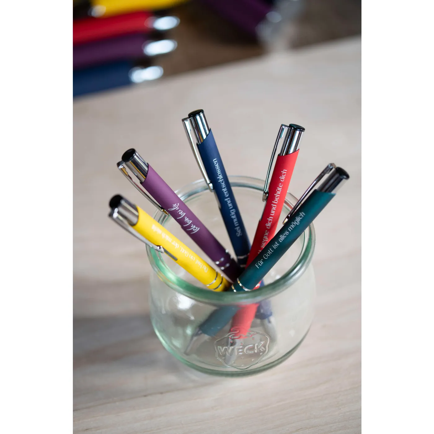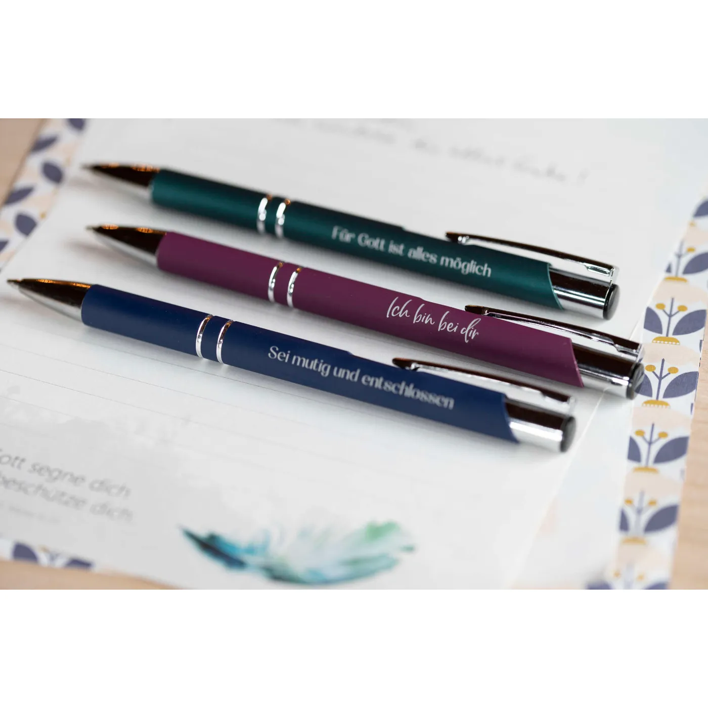Kugelschreiber im Etui - Ich bin bei dir (Schreibwaren) Die schönen Kugelschreiber mit aufgedruckter Botschaft sind der perfekte Begleiter für jeden Tag. In dem ungewöhnlichen runden Etui ist der Stift ein ideales Geschenk zum Geburtstag oder zu Weihnachten oder einfach nur so für alle Schreibbegeisterten. 7,95 € Lieferbar Bestellen Sie den Artikel jetzt auf: Details Verlag: Gerth Medien Artikel-Nr.: 558419700 EAN: 4029856841977 Sachgebiet: Schreibgeräte Hinweise: Farbe der Wechselmine: schwarz Maße: 2,3 x 15 x 2,3 cm Gewicht: 45g Angaben zum Hersteller nach GPSR: Gerth Medien i.d. SCM Verlagsgruppe GmbH Berliner Ring 62 35576 Wetzlar DEUTSCHLAND info@scm-verlagsgruppe.de Weitere Details Bewertungen Für dieses Produkt gibt es noch keine Rezensionen. Das könnte Sie auch interessieren zur Produktseite von Kugelschreiber im Etui - Für Gott ist alles möglich Kugelschreiber im Etui - Für Gott ist alles möglich Schreibwaren 7,95 € Lieferbar zur Produktseite von Kugelschreiber im Etui - Gott segne dich und behüte dich Kugelschreiber im Etui - Gott segne dich und behüte ... Schreibwaren 7,95 € Lieferbar zur Produktseite von Kugelschreiber im Etui - Sei mutig und entschlossen Kugelschreiber im Etui - Sei mutig und entschlossen Schreibwaren 7,95 € Lieferbar zur Produktseite von Kugelschreiber im Etui - Du bist ein Gott, der mich sieht Kugelschreiber im Etui - Du bist ein Gott, der mich ... Schreibwaren 7,95 € Lieferbar zur Produktseite von Wunderbar gemacht - Notizheft-Set Wunderbar gemacht - Notizheft-Set Schreibwaren - Geheftet 12,95 € Lieferbar zur Produktseite von Notizblock "Gott segne dich" - groß Notizblock "Gott segne dich" - groß Schreibwaren 9,95 € Lieferbar zur Produktseite von GartenGlück - Notizheft-Set GartenGlück - Notizheft-Set Schreibwaren - Geheftet 12,95 € Lieferbar