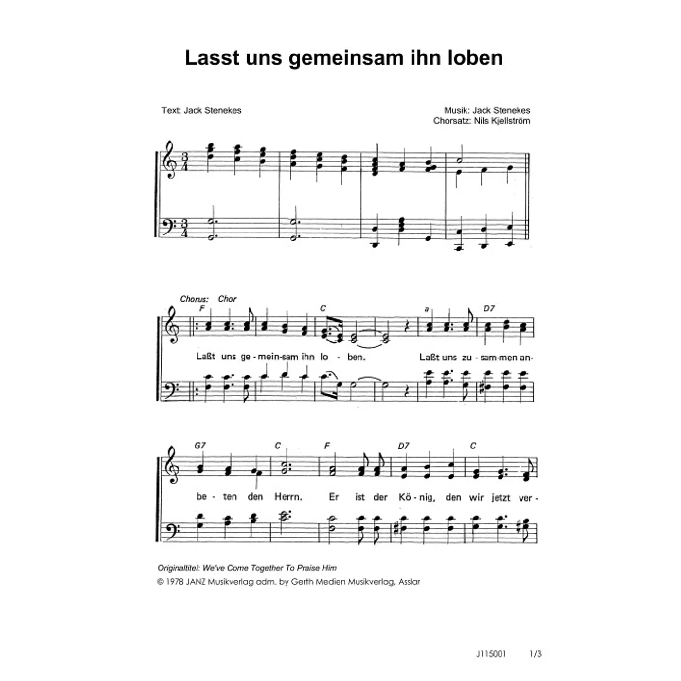 Lasst uns gemeinsam ihn loben (diese Variante haben Sie gerade ausgewählt) (traditionell, gemischter Chor, mit Akkorden, vierstimmig, C-Dur) Nils Kjellström (Chorsatz), Jack Stenekes (Text, Komposition) |