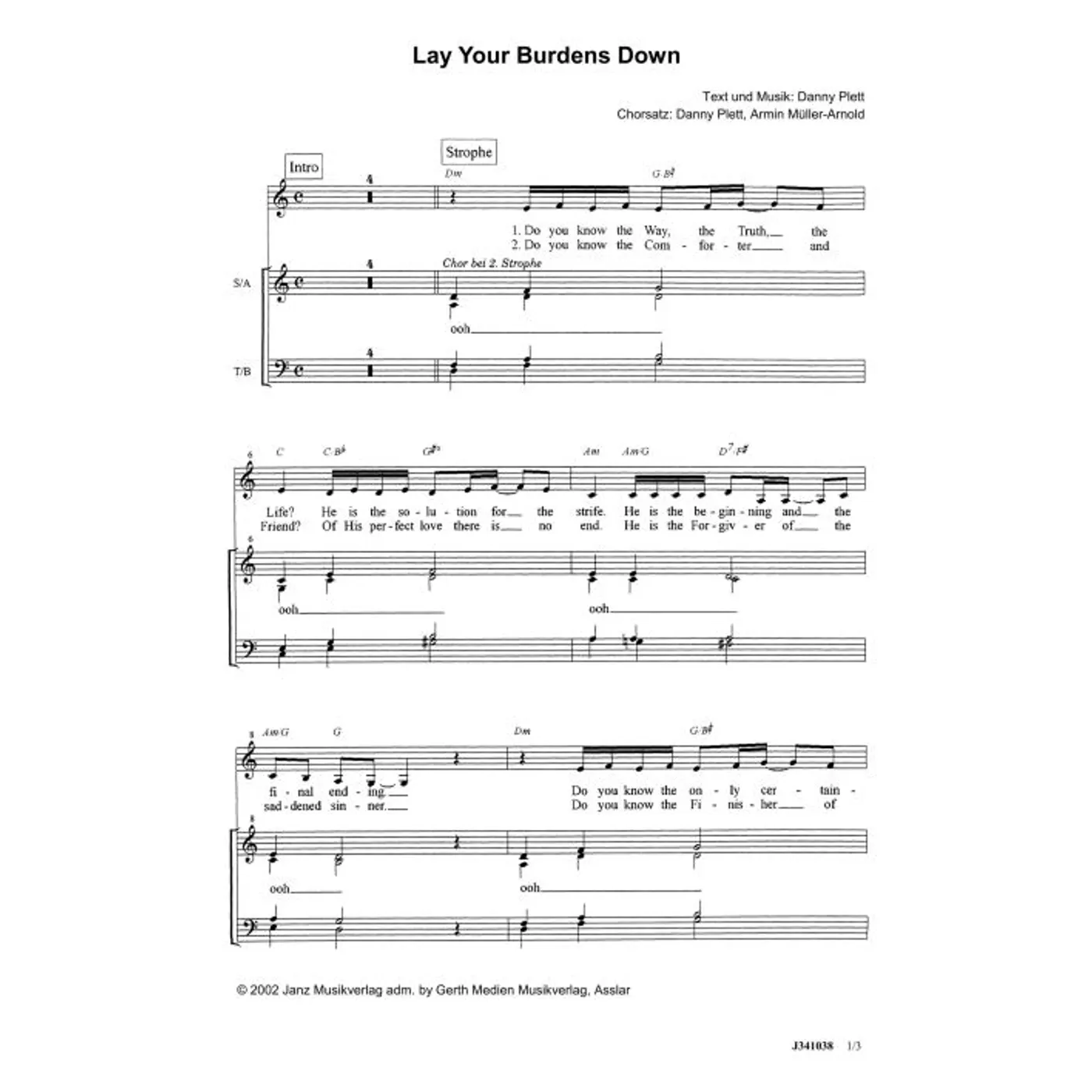 Lay Your Burdens Down (modern, Klavier, gemischter Chor, mit Akkorden, vierstimmig, C-Dur) Danny Plett (Komposition, Text, Chorsatz), Armin Müller-Arnold (Klaviersatz) | modern, Klavier, gemischter Chor, mit Akkorden, vierstimmig, C-Dur | 3,80 € |
