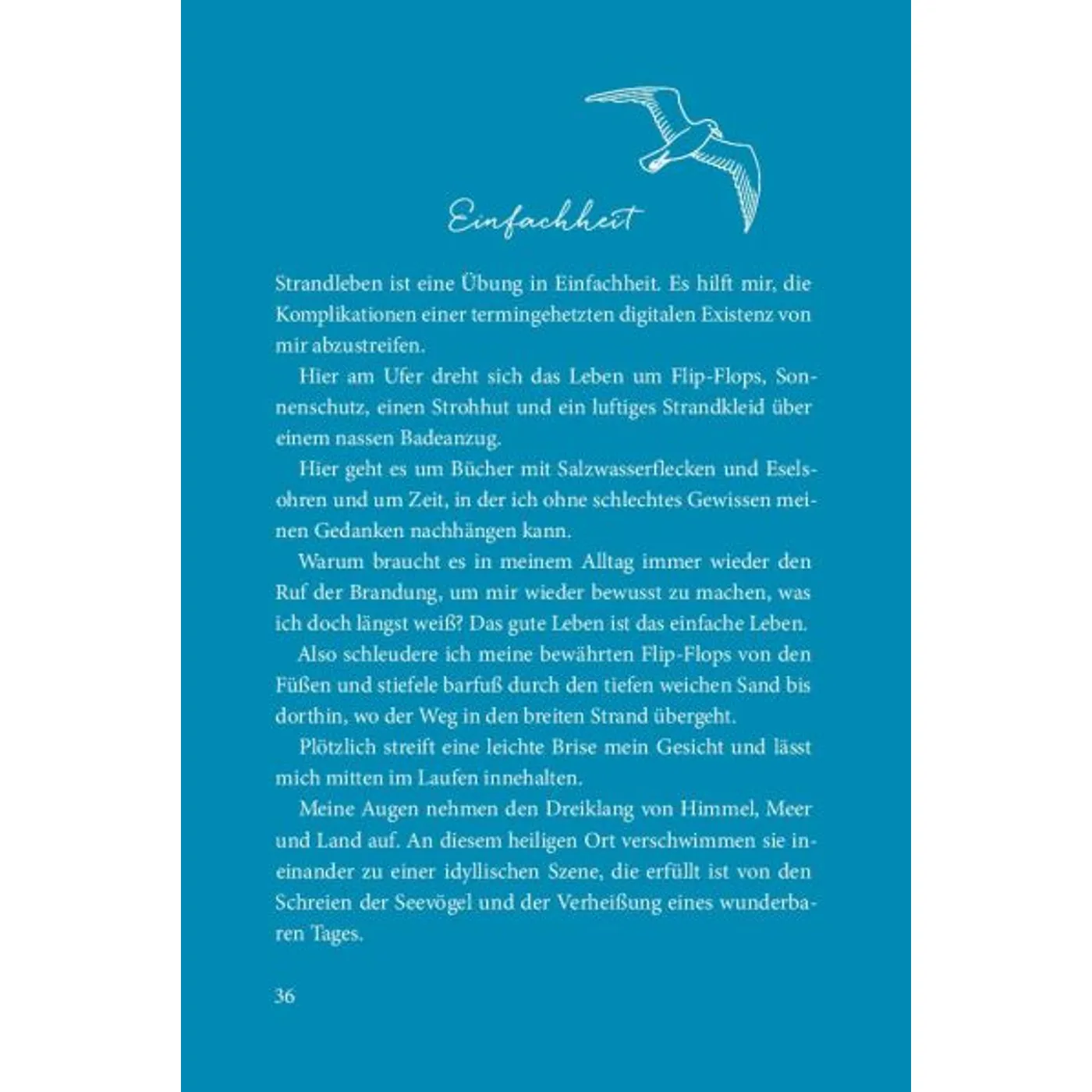 Kleine Geschichten, Anekdoten, Lied- und Gedichtzeilen, Sinnsprüche und Bibelzitate zum Thema Meeer sind von der Herausgeberin liebevoll zusammengetragen und zu einem Alltagsbegleiter gegen Stress und Zweifel arrangiert worden, der in jede Tasche, Rucksack oder ins Handschuhfach passt. Meeresrauschen, Möwengeschrei und das Gefühl, den warmen Sand zwischen den Zehen zu spüren machen das Herz weit und die Seele frei. -
