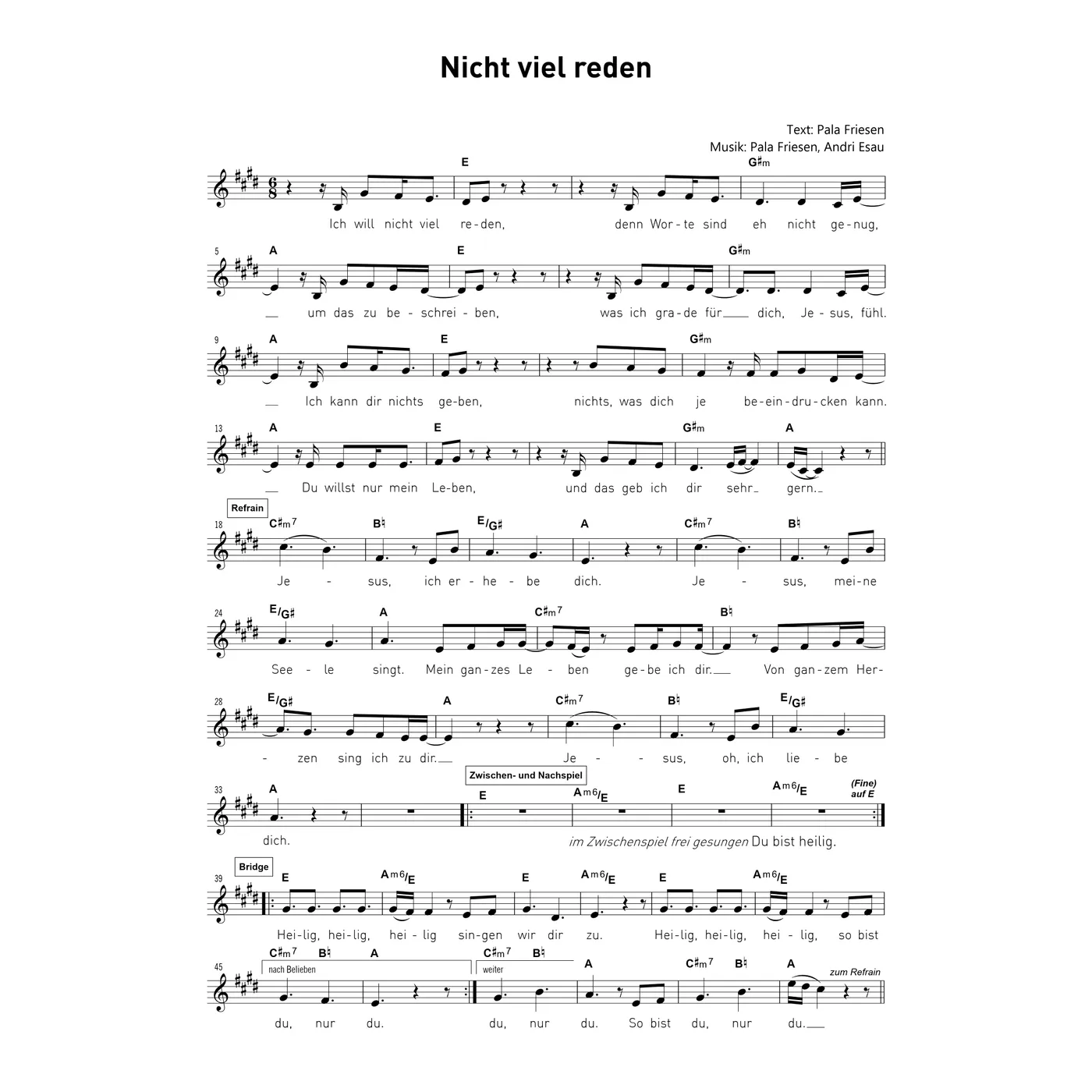 Nicht viel reden (diese Variante haben Sie gerade ausgewählt) (Worship, einstimmig, E-Dur) Andri Esau (Melodie), Pala Friesen (Text, Melodie) |