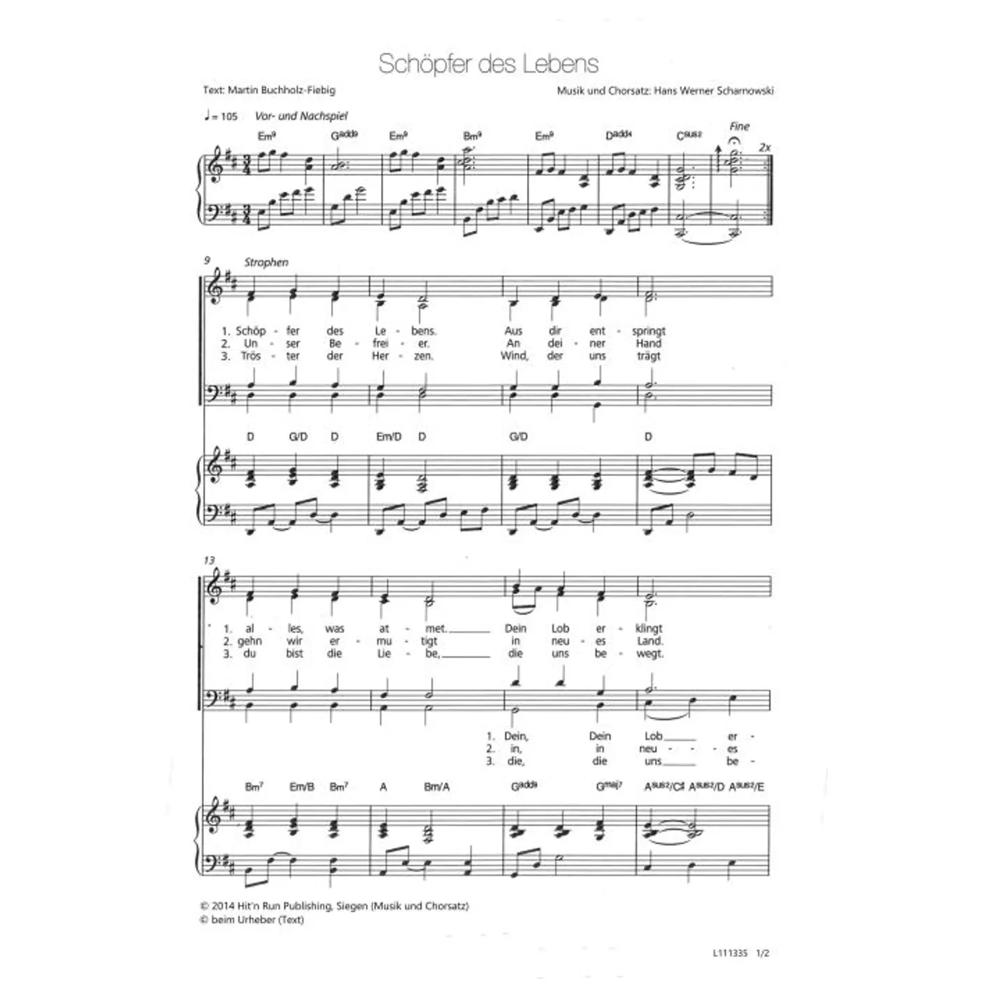 Dies ist ein Download-Artikel und kann nach dem Kauf digital heruntergeladen werden. Vorschau Hans Werner Scharnowski (Komposition, Chorsatz) Martin Buchholz-Fiebig (Text) Schöpfer des Lebens Gemischter Chor SATB / Klavierbegleitung (Noten - Download) Bitte beachten Sie: Downloads sind aktuell nur in Deutschland erhältlich. Bitte wählen Sie aus, für wie viele Kopien/Ausdrucke Sie eine Lizenz erwerben möchten. Die Lizenz wird entsprechend auf dem Dokument vermerkt. Noten - Download Weitere Varianten Alle Varianten anzeigen und vergleichen 1,50 € Sofort Lieferbar (per Download) Günstige Mengenpreise verfügbar Günstige Mengenpreise (DE) Kaufen Sie 2 zum Preis von je 1,43 € und sparen Sie 5% Kaufen Sie 10 zum Preis von je 1,35 € und sparen Sie 10% Kaufen Sie 25 zum Preis von je 1,28 € und sparen Sie 15% Kaufen Sie 50 zum Preis von je 1,20 € und sparen Sie 20% Kaufen Sie 100 zum Preis von je 1,13 € und sparen Sie 25% Lizenz pro Kopie/Ausdruck: Bestellen Sie den Artikel jetzt auf: Informationen zur Lizenz Details Erscheinungstermin: 08.03.2016 Verlag: Hit´n Run Publishing Artikel-Nr.: W80029128 Tonart: D-Dur Stil/Genre: modern Satz: gemischter Chor, mit Akkorden, vierstimmig Seitenzahl: 2 S. Hinweise: DIN A4 Dateigröße insg.: 543,0 Kilobyte Dieses Produkt ist preisgebunden: Ja Download-Material: L111335 (PDF) Angaben zum Hersteller nach GPSR: Gerth Medien i.d. SCM Verlagsgruppe GmbH Berliner Ring 62 35576 Wetzlar DEUTSCHLAND info@scm-verlagsgruppe.de Weitere Details Weitere Varianten Noten-Downloads Schöpfer des Lebens (diese Variante haben Sie gerade ausgewählt) (modern, gemischter Chor, mit Akkorden, vierstimmig, D-Dur) Hans Werner Scharnowski (Komposition, Chorsatz), Martin Buchholz-Fiebig (Text) modern, gemischter Chor, mit Akkorden, vierstimmig, D-Dur 1,50 € Schöpfer des Lebens (modern, gemischter Chor, mit Akkorden, vierstimmig, D-Dur) Hans Werner Scharnowski (Komposition, Chorsatz), Martin Buchholz-Fiebig (Text) modern, gemischter Chor, mit Akkorden, vierstimmig, D-Dur 2,00 € Die Preise stellen die Einzelpreise der jeweils verfügbaren Einzeldownloads dar. Bewertungen Für dieses Produkt gibt es noch keine Rezensionen. Weitere Artikel von Hans Werner Scharnowski zur Produktseite von Schlaumeier - alle 8 Folgen Schlaumeier - alle 8 Folgen MP3-Hörspiel - Download 19,99 € 39,99 € Download zur Produktseite von Jesus am Kreuz Jesus am Kreuz Noten - Download 2,00 € Download zur Produktseite von Unser Vater Unser Vater Noten - Download 1,50 € Download zur Produktseite von Unser Vater Unser Vater Noten - Download 1,50 € Download zur Produktseite von Lasst euch von der Liebe leiten Lasst euch von der Liebe leiten Noten - Download 1,50 € Download zur Produktseite von Unser Vater Unser Vater Noten - Download 2,50 € Download zur Produktseite von Unser Vater (Violoncello) Unser Vater (Violoncello) Noten - Download 2,80 € Download zur Produktseite von Unser Vater (Violine 1) Unser Vater (Violine 1) Noten - Download 2,80 € Download zur Produktseite von Unser Vater (Viola) Unser Vater (Viola) Noten - Download 2,80 € Download zur Produktseite von Unser Vater (Kontrabass) Unser Vater (Kontrabass) Noten - Download 2,80 € Download zur Produktseite von Unser Vater (Violine 2) Unser Vater (Violine 2) Noten - Download 2,80 € Download zur Produktseite von König Jesus König Jesus Noten - Download 10,80 € Download Alle Artikel von Hans Werner Scharnowski anzeigen Das könnte Sie auch interessieren zur Produktseite von Herr aller Hoffnung Herr aller Hoffnung Noten - Download 4,80 € Download zur Produktseite von Leuchten Leuchten Noten - Download 1,50 € Download zur Produktseite von Gib deinen Segen Gib deinen Segen Noten - Download 2,50 € Download zur Produktseite von Gott hat uns nicht vergessen Gott hat uns nicht vergessen Noten - Download 2,00 € Download